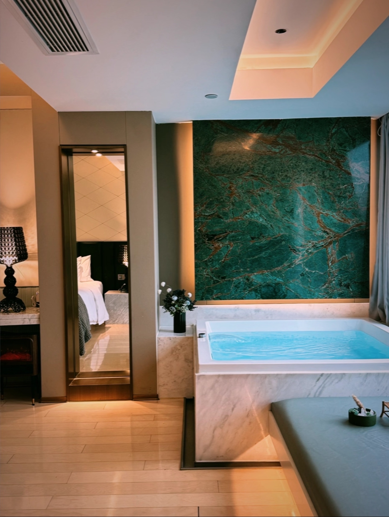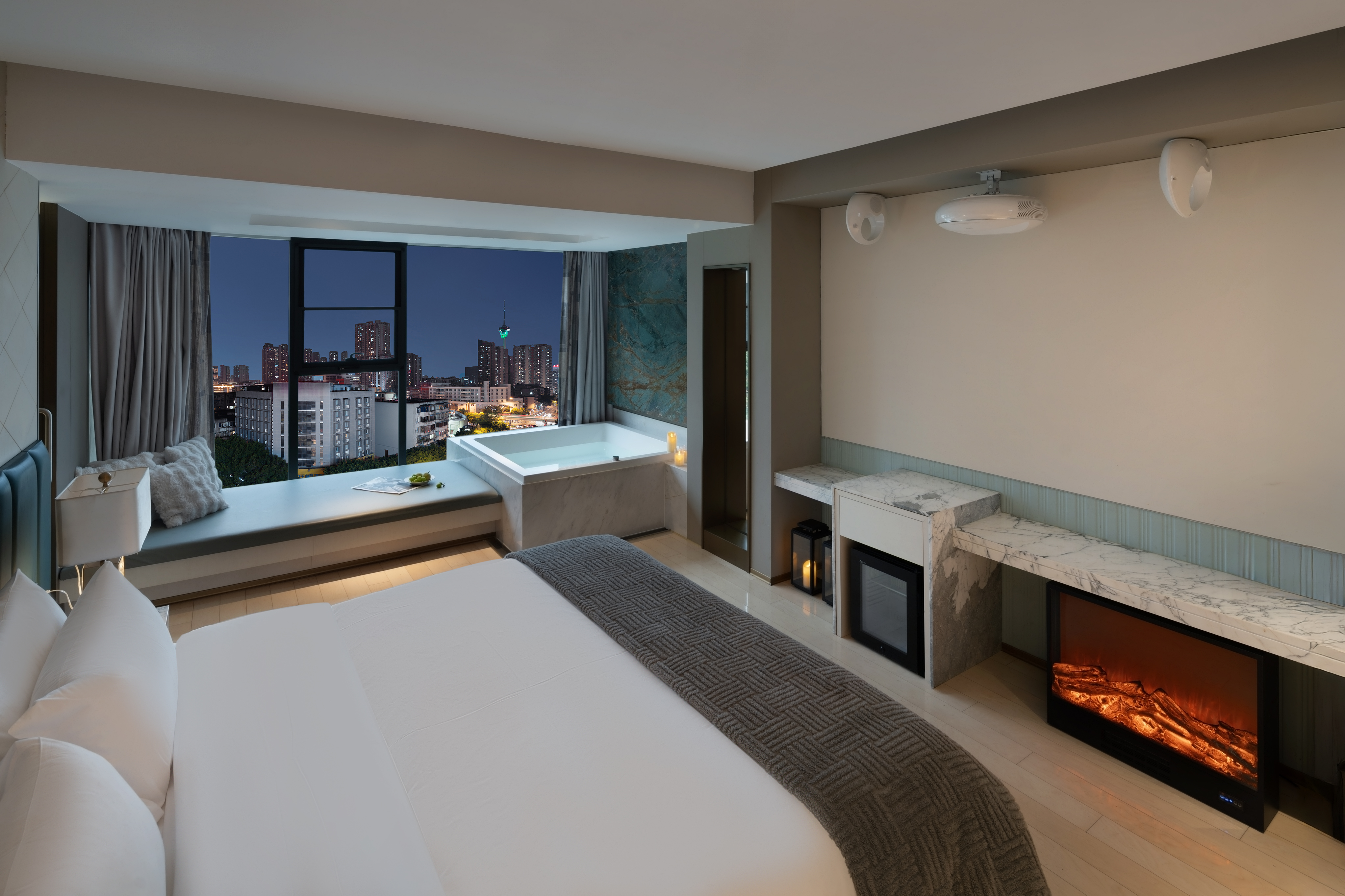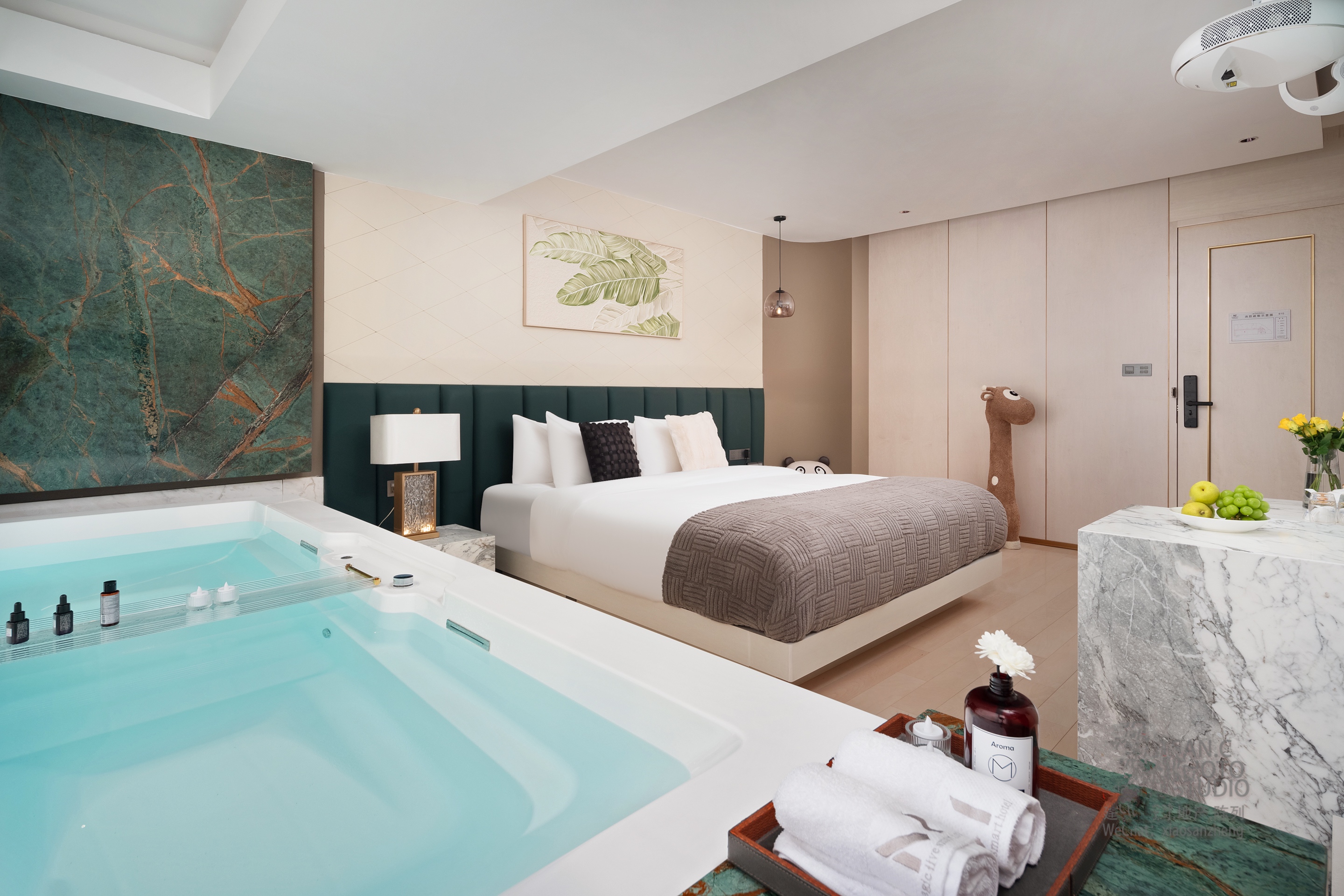 电影地台全景汤池家庭房(激光投影+地台+泡池)