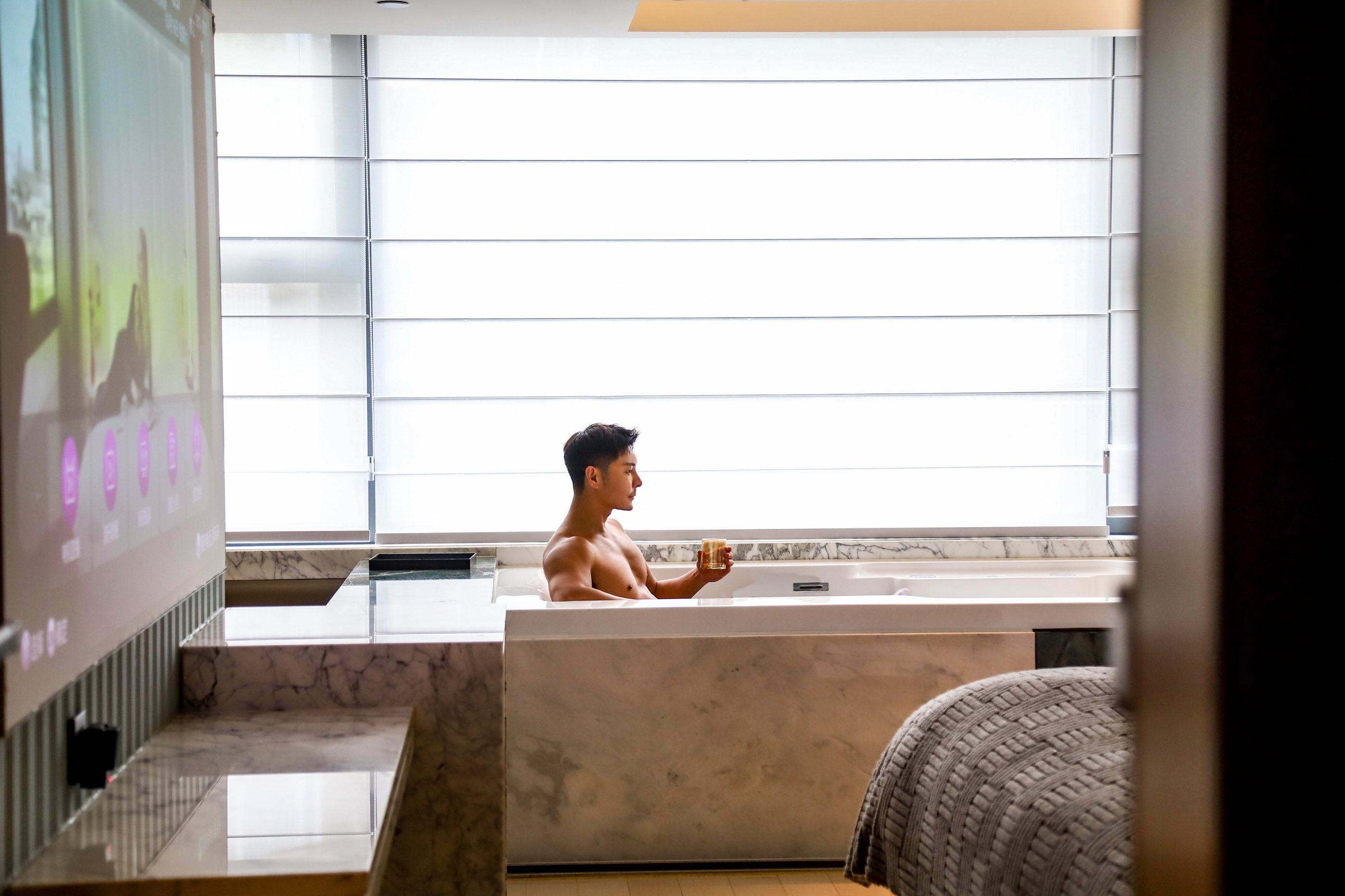 电影地台超大汤池冲浪亲子房(激光投影+地台+泡池)