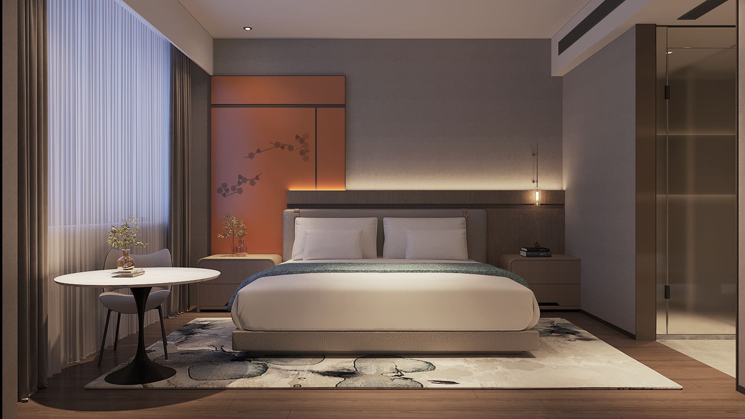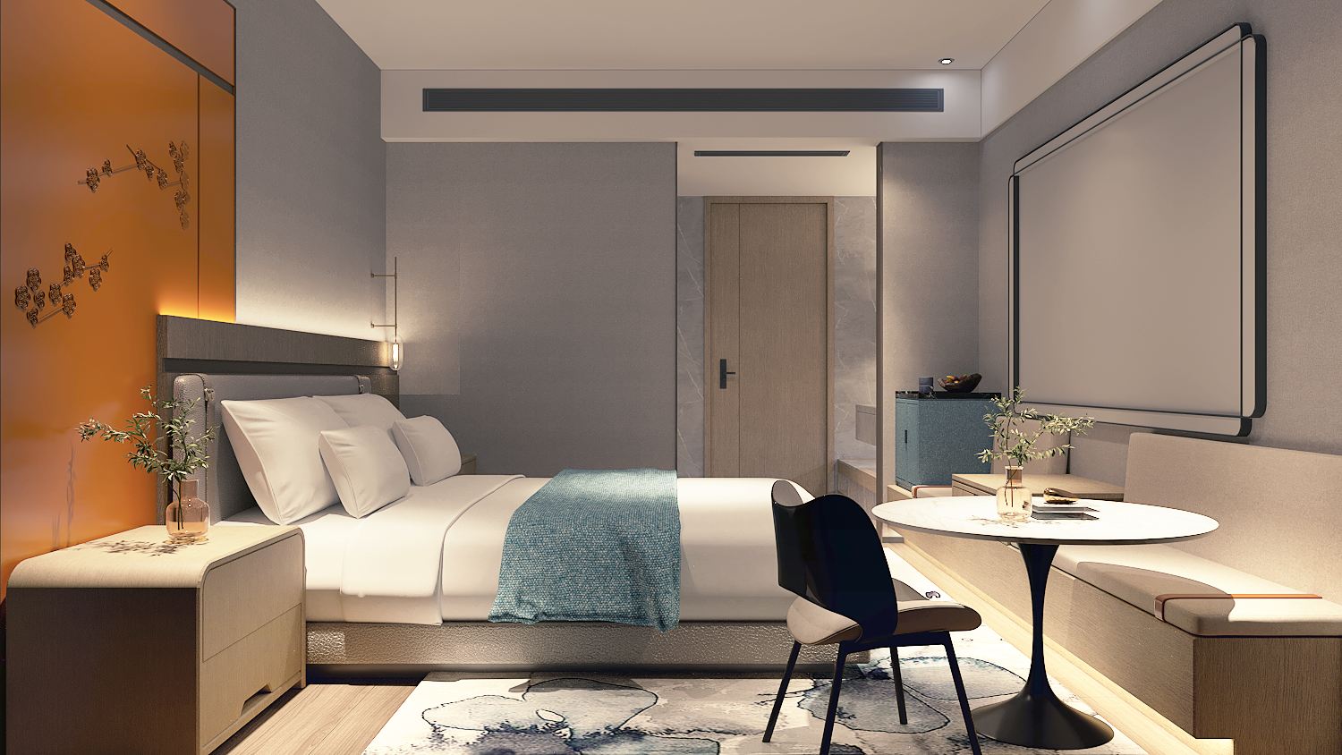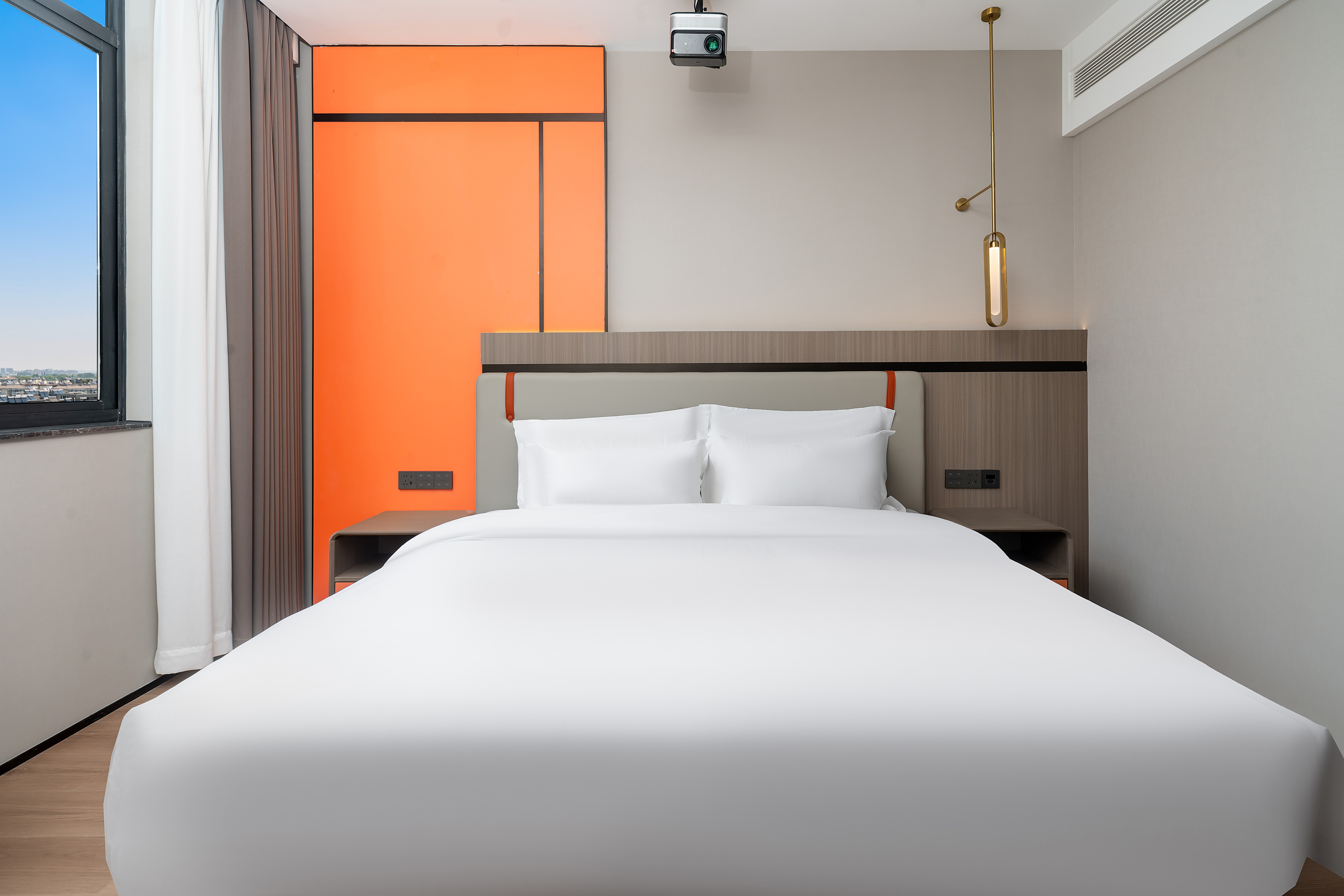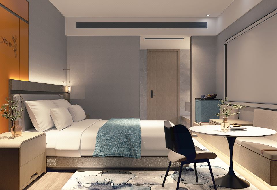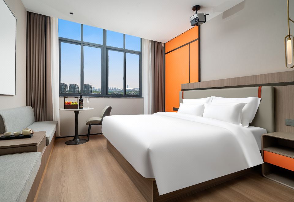 Simple Double Bed Room With 4K Ultra Hd Cinema, Landmark Night View, And Smart Guest Control