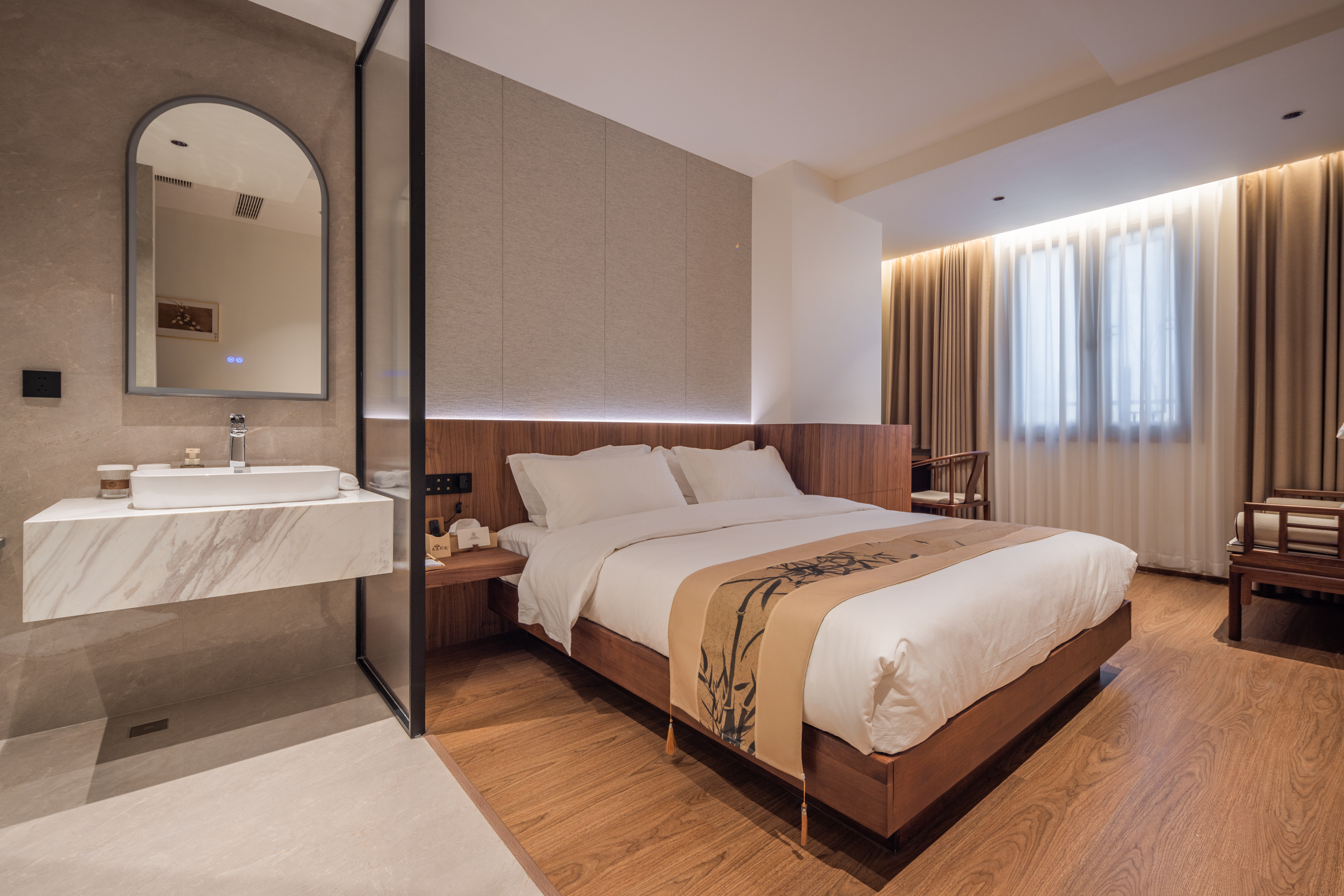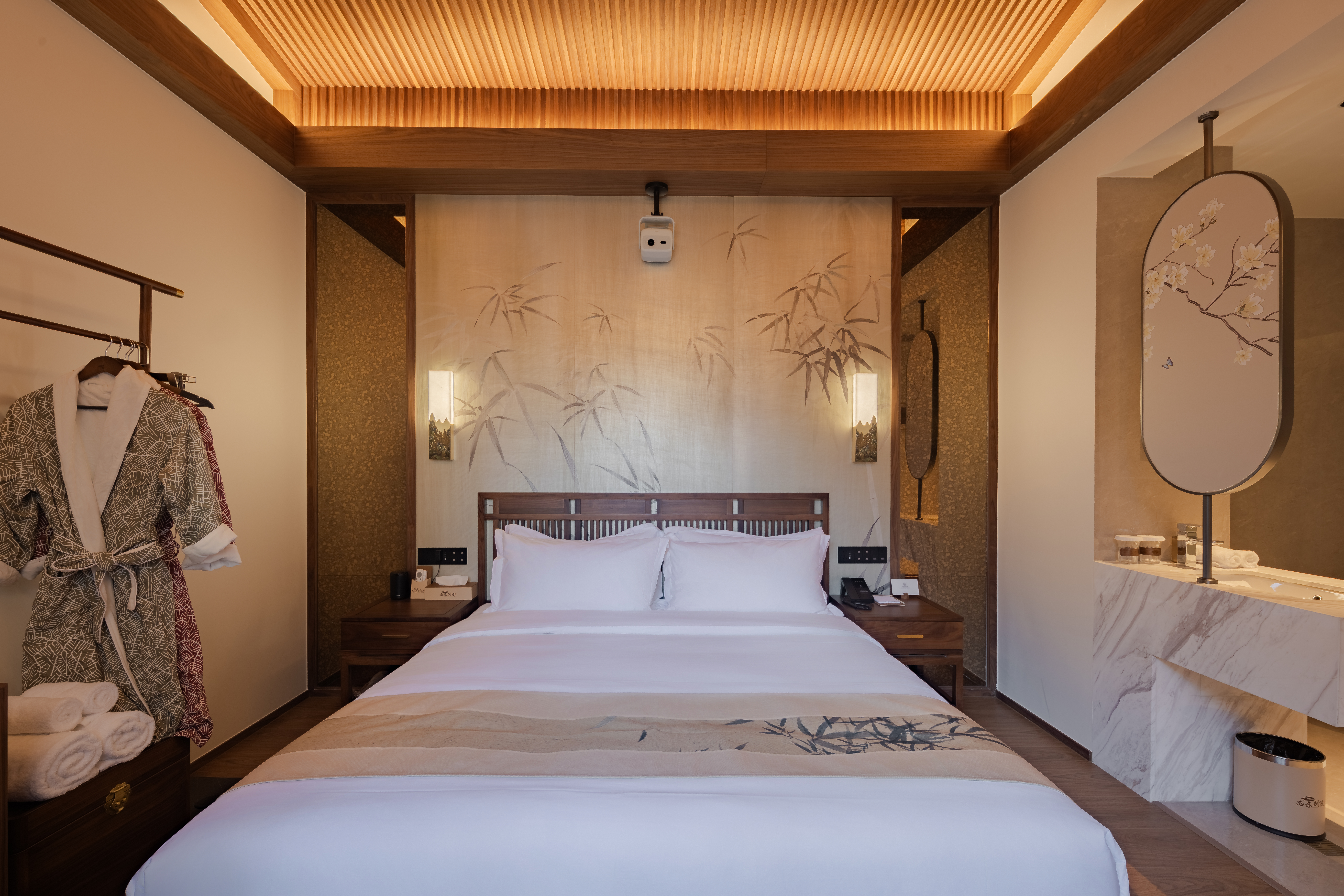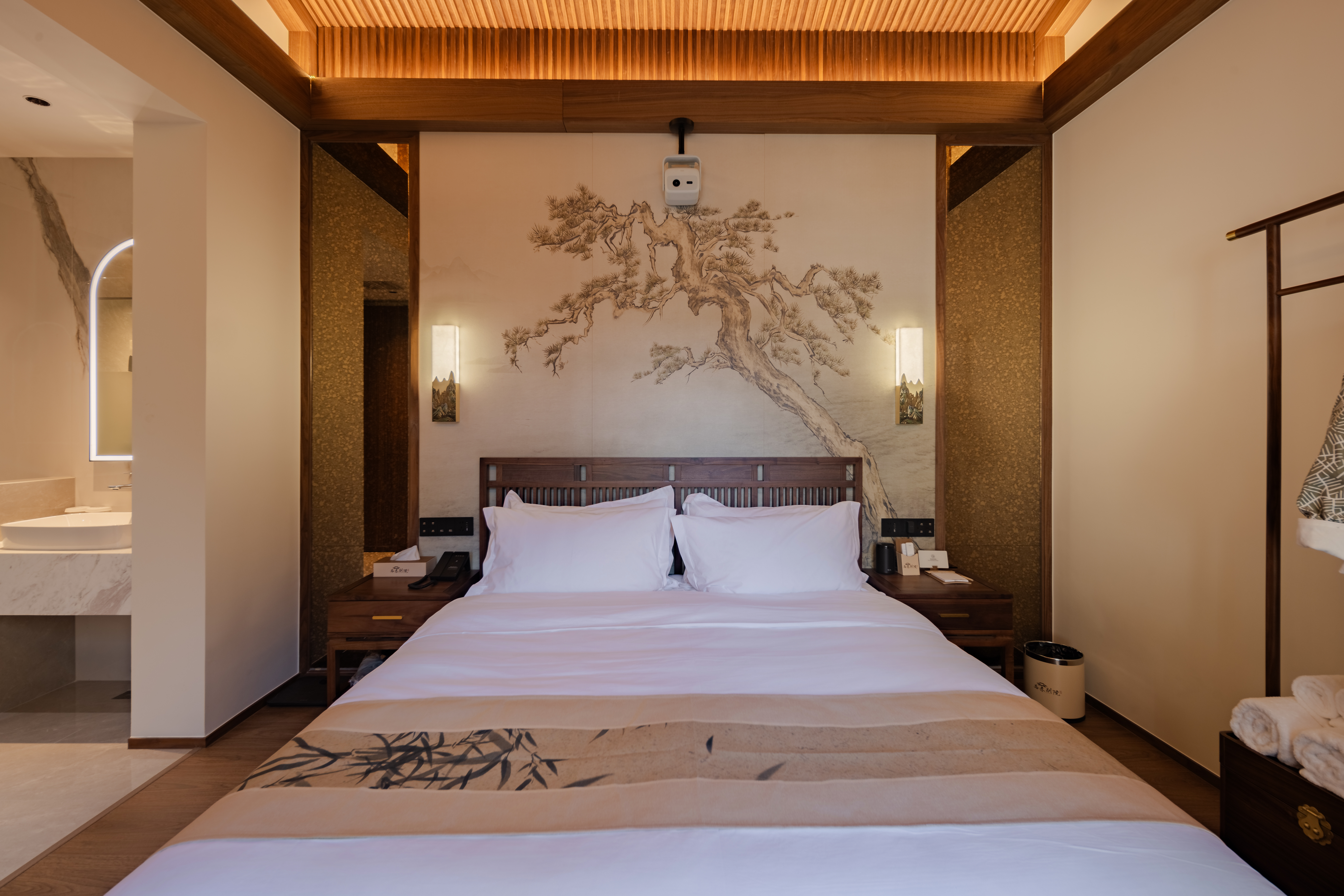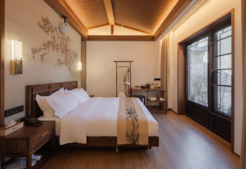 沐陽大床房(新中式院落景+愛意沉浸式深睡舒眠超靜音零壓床墊+MINI冰箱+蘇紡親膚全鵝絨被芯+負離子加濕器+藍牙音箱)