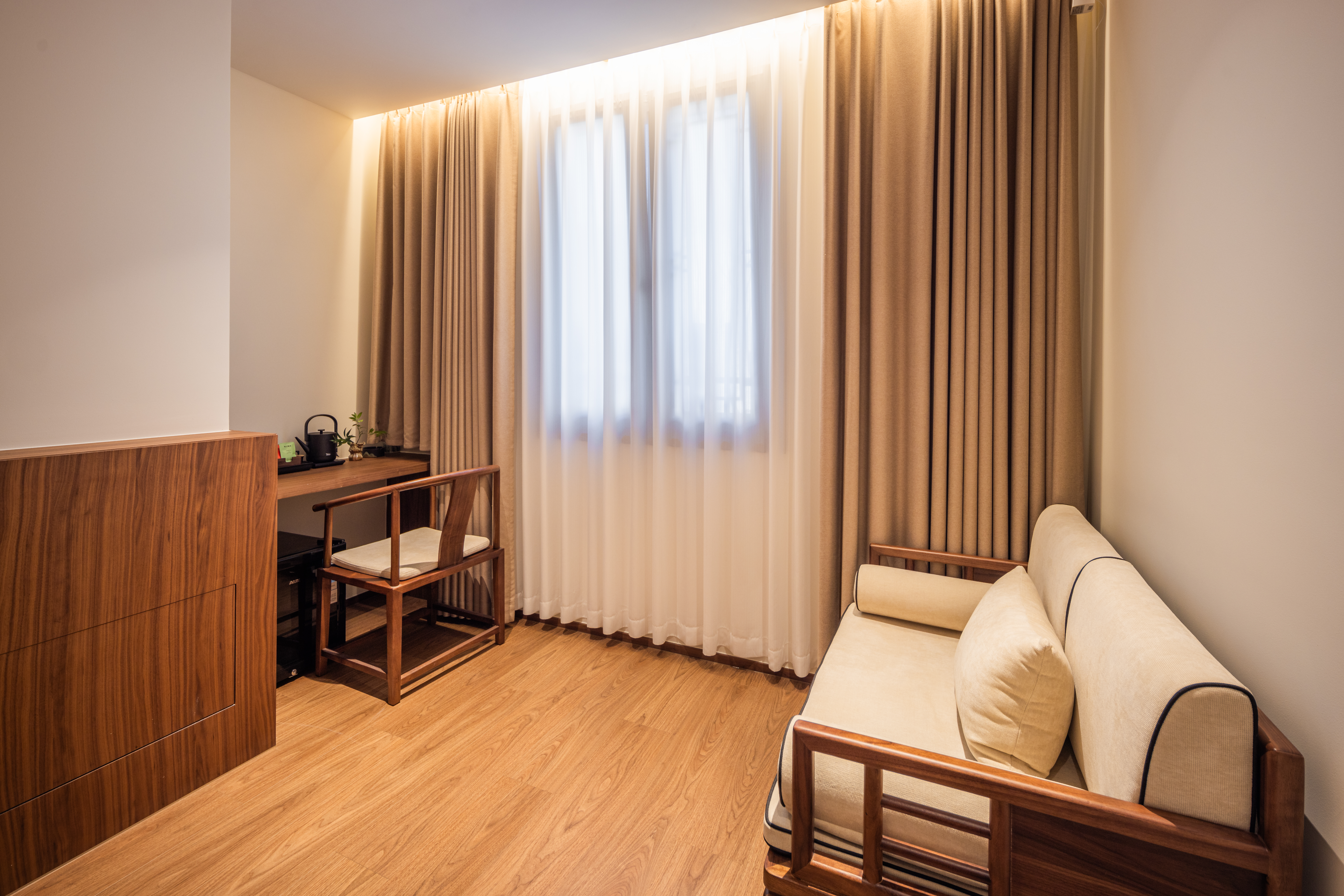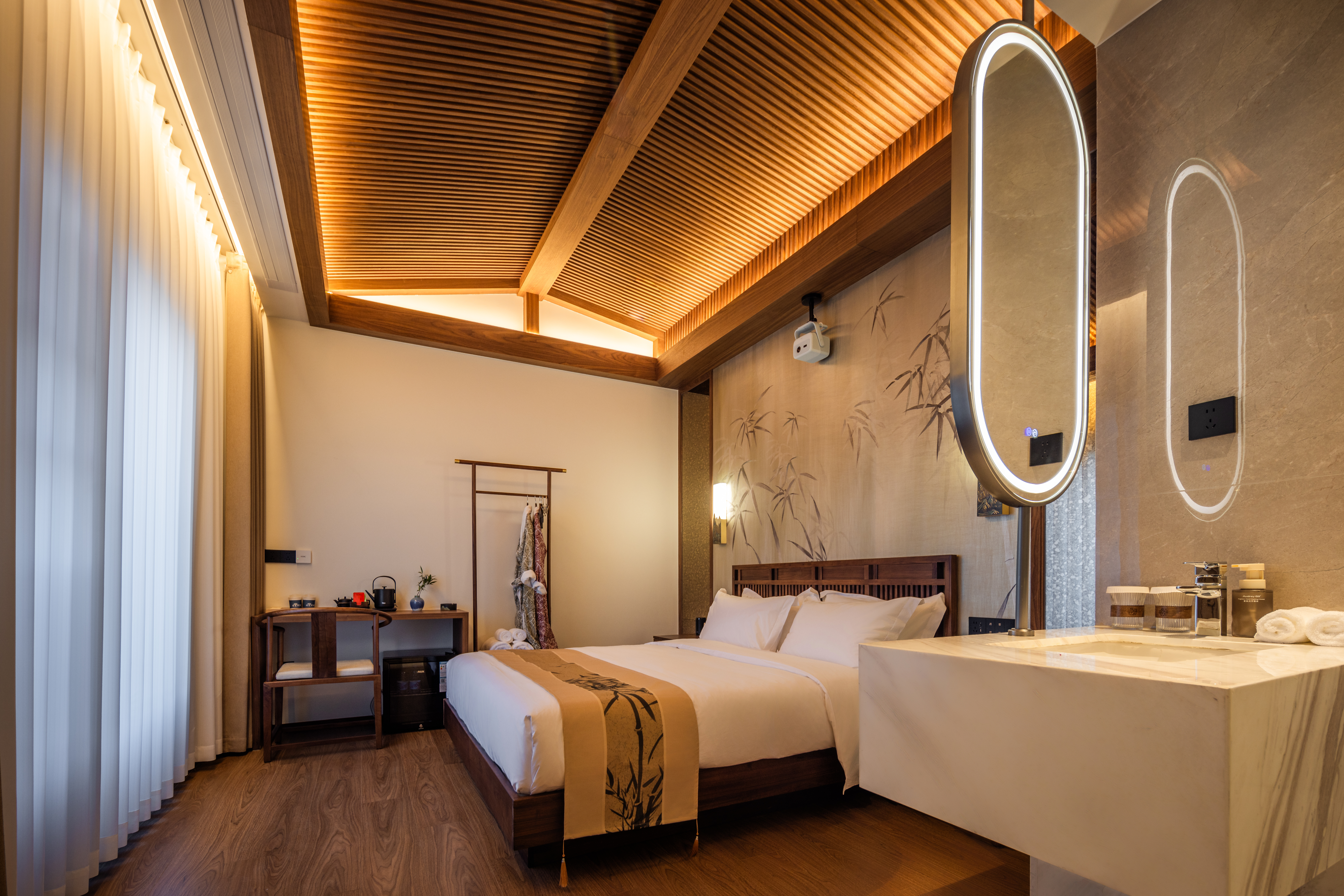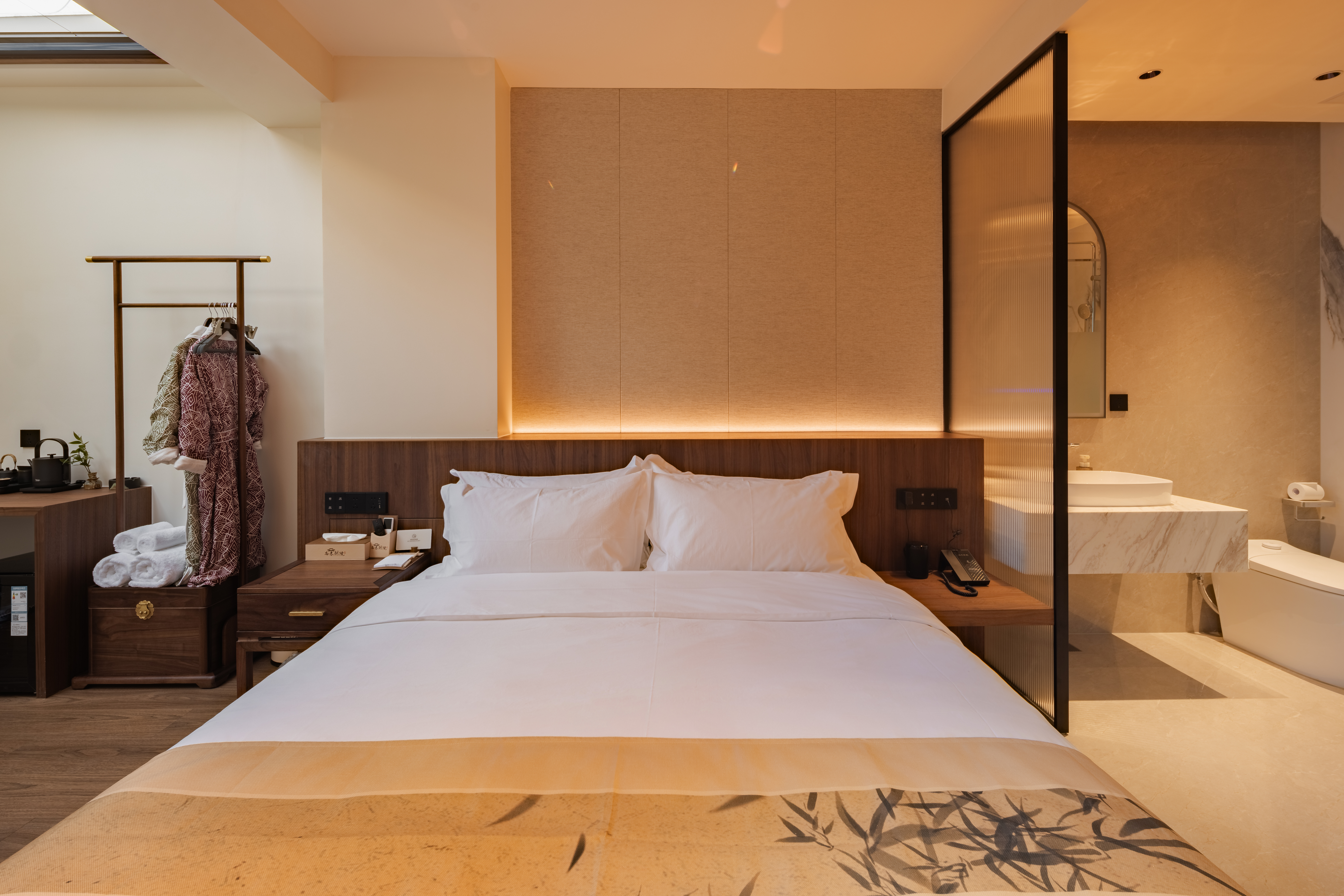 沐陽大床房(新中式院落景+愛意沉浸式深睡舒眠超靜音零壓床墊+MINI冰箱+蘇紡親膚全鵝絨被芯+負離子加濕器+藍牙音箱)