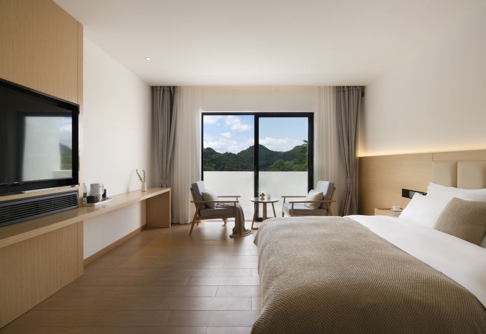 [山麓]山景阳台大床房+全景落地玻璃+可日落揽景+极佳视野+舒适桌椅+全屋智能+高级床品+独立衞浴+智能音响小度