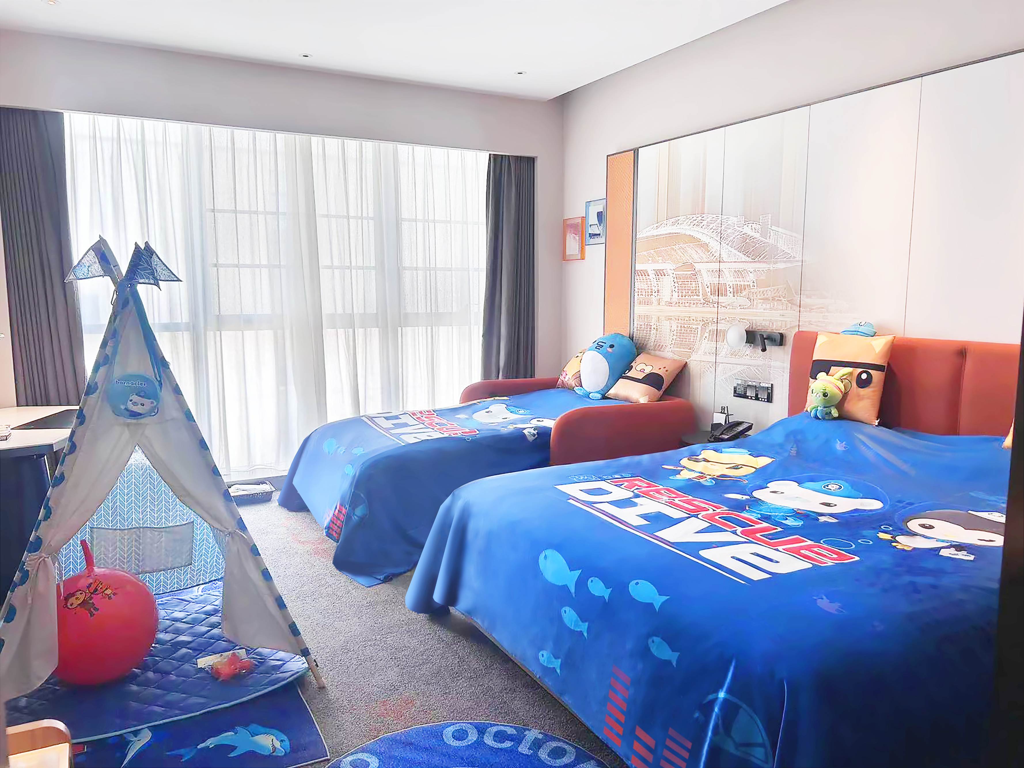 萌娃最爱·海底小纵队亲子主题房-大床带梳化床