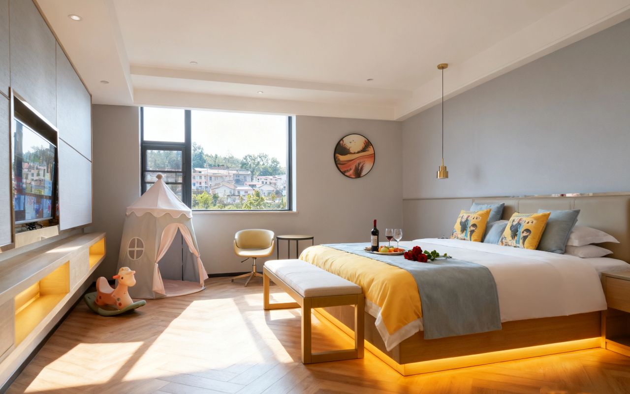 行政亲子主题房[超大床垫?电动窗帘?小童用具?舒静眠]