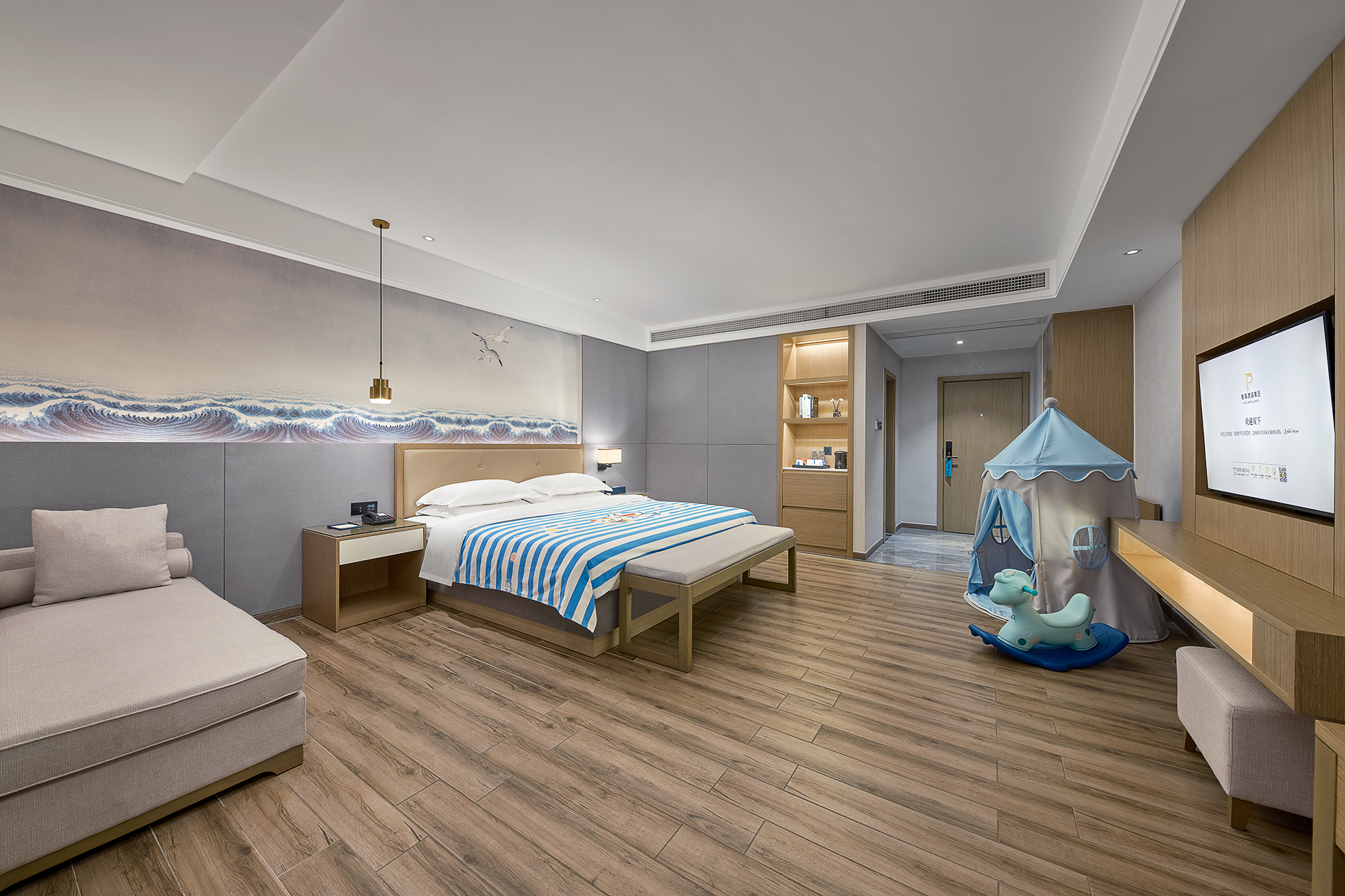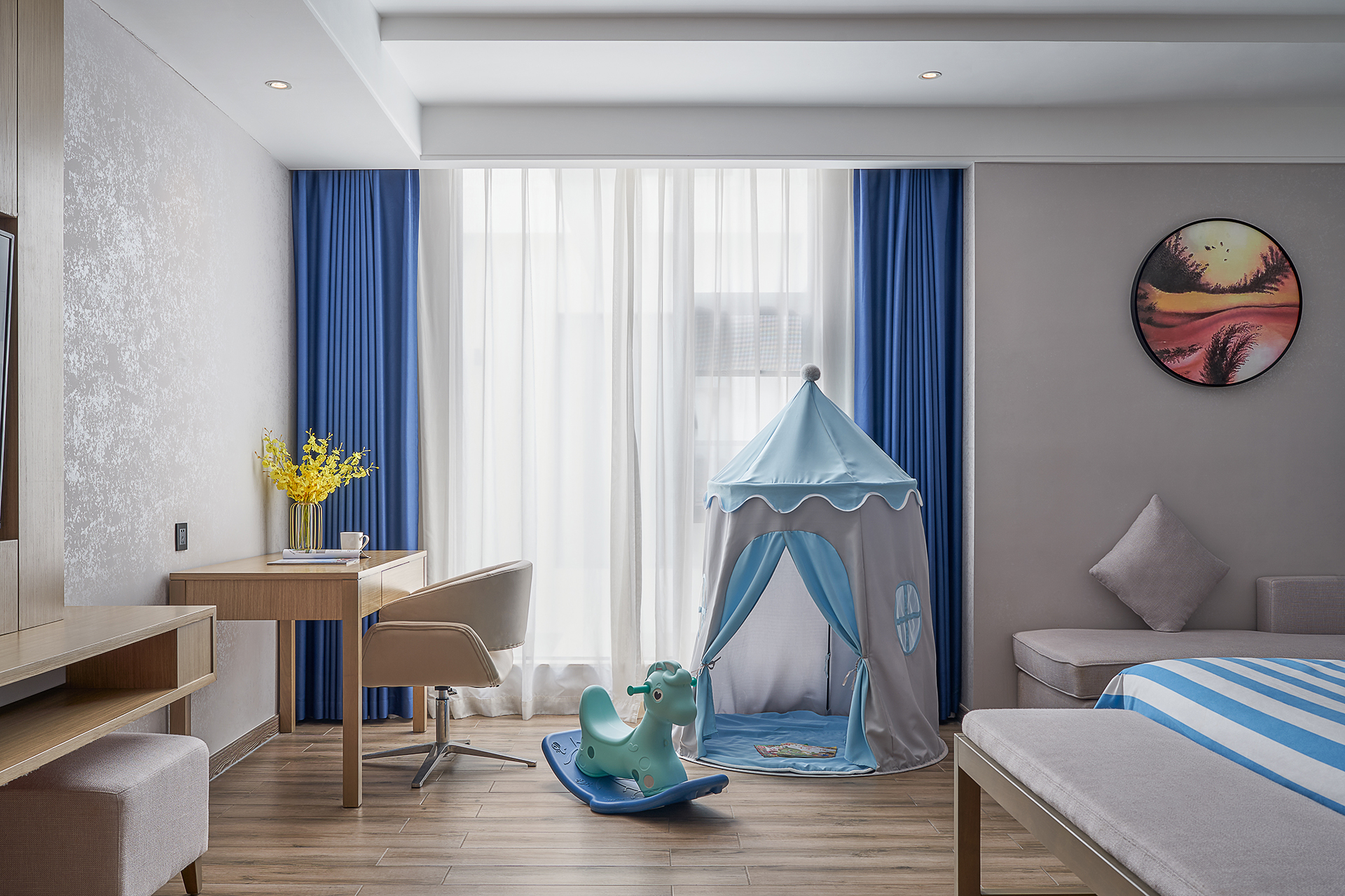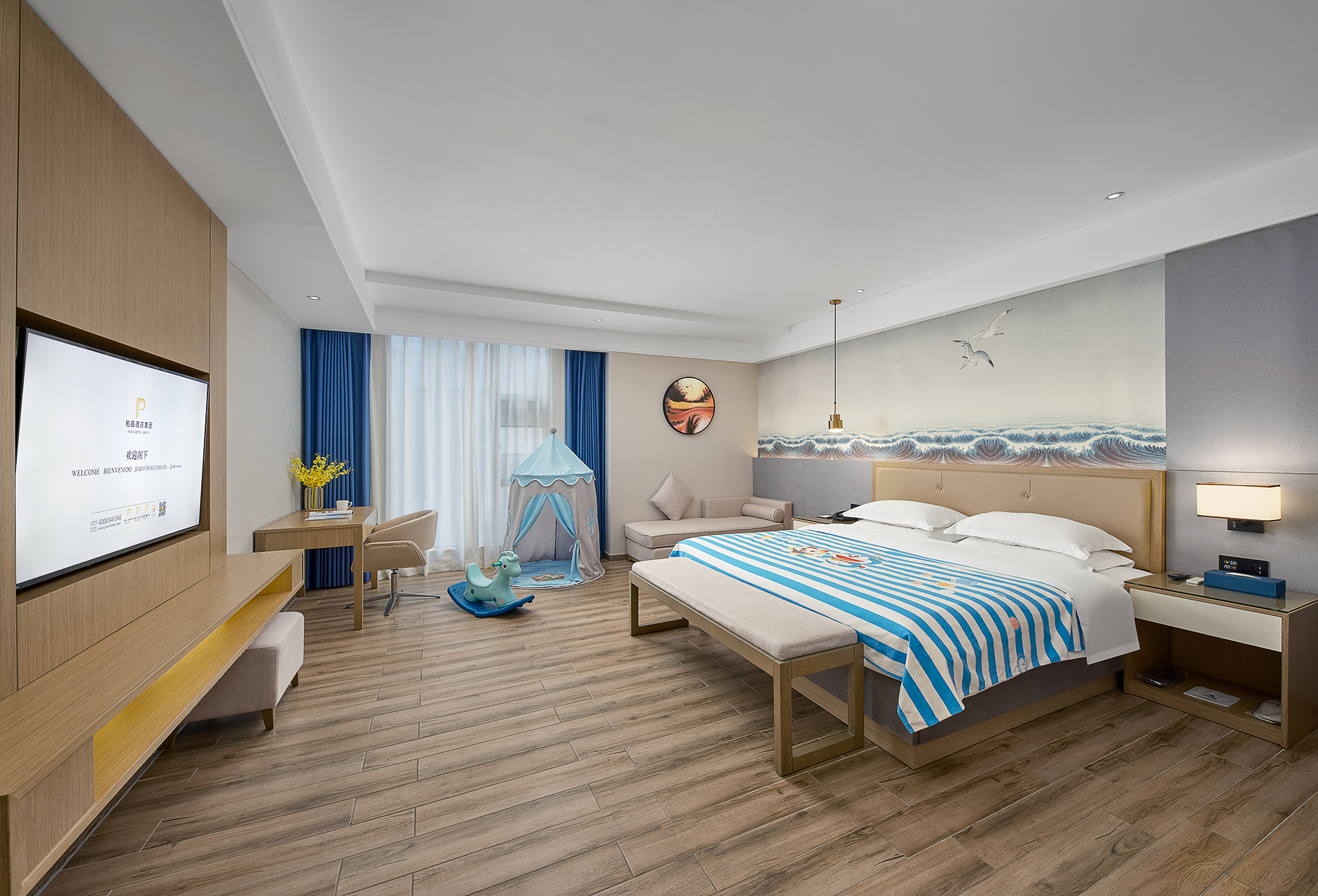 行政亲子主题房[超大床垫?电动窗帘?小童用具?舒静眠]