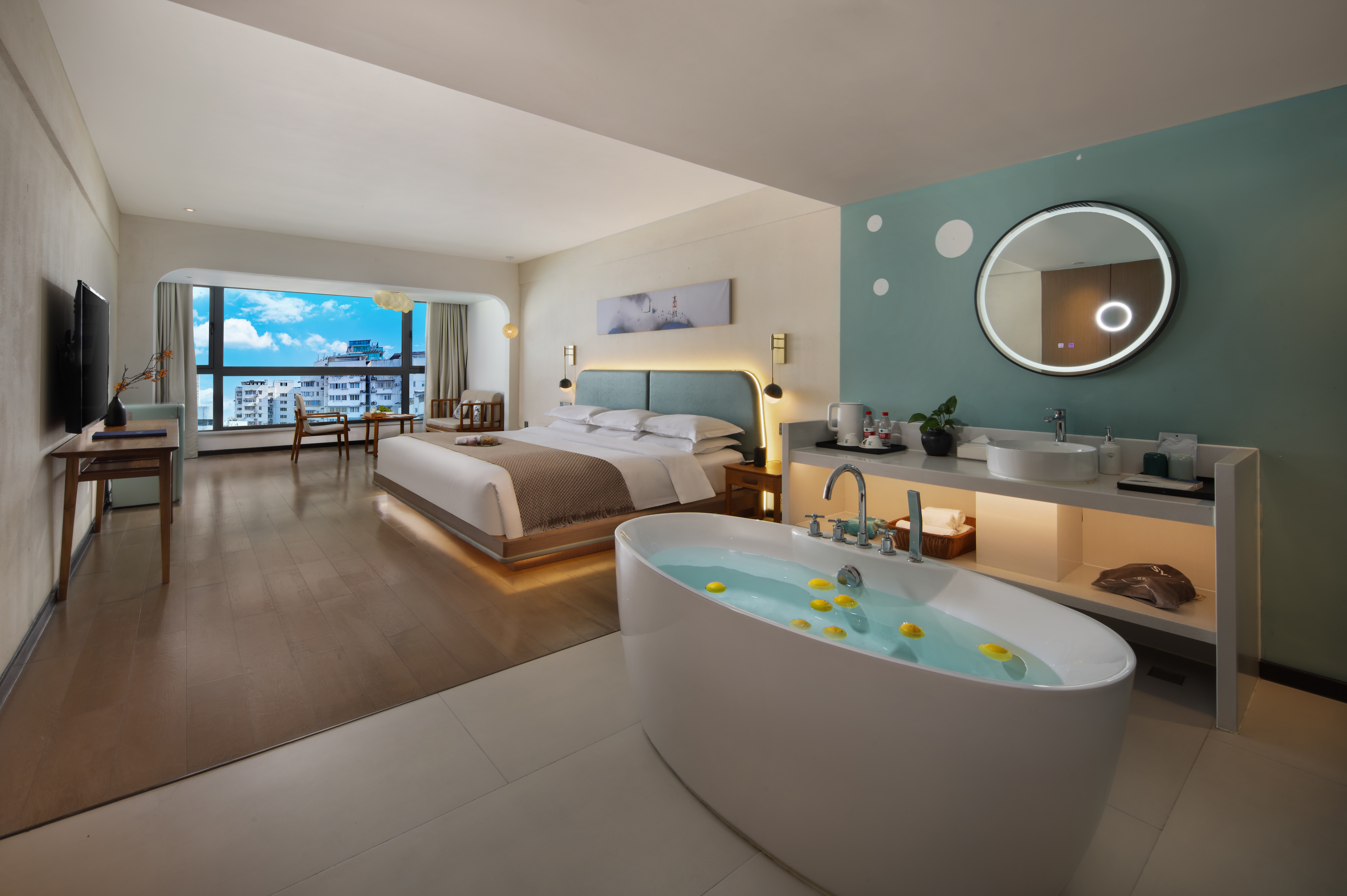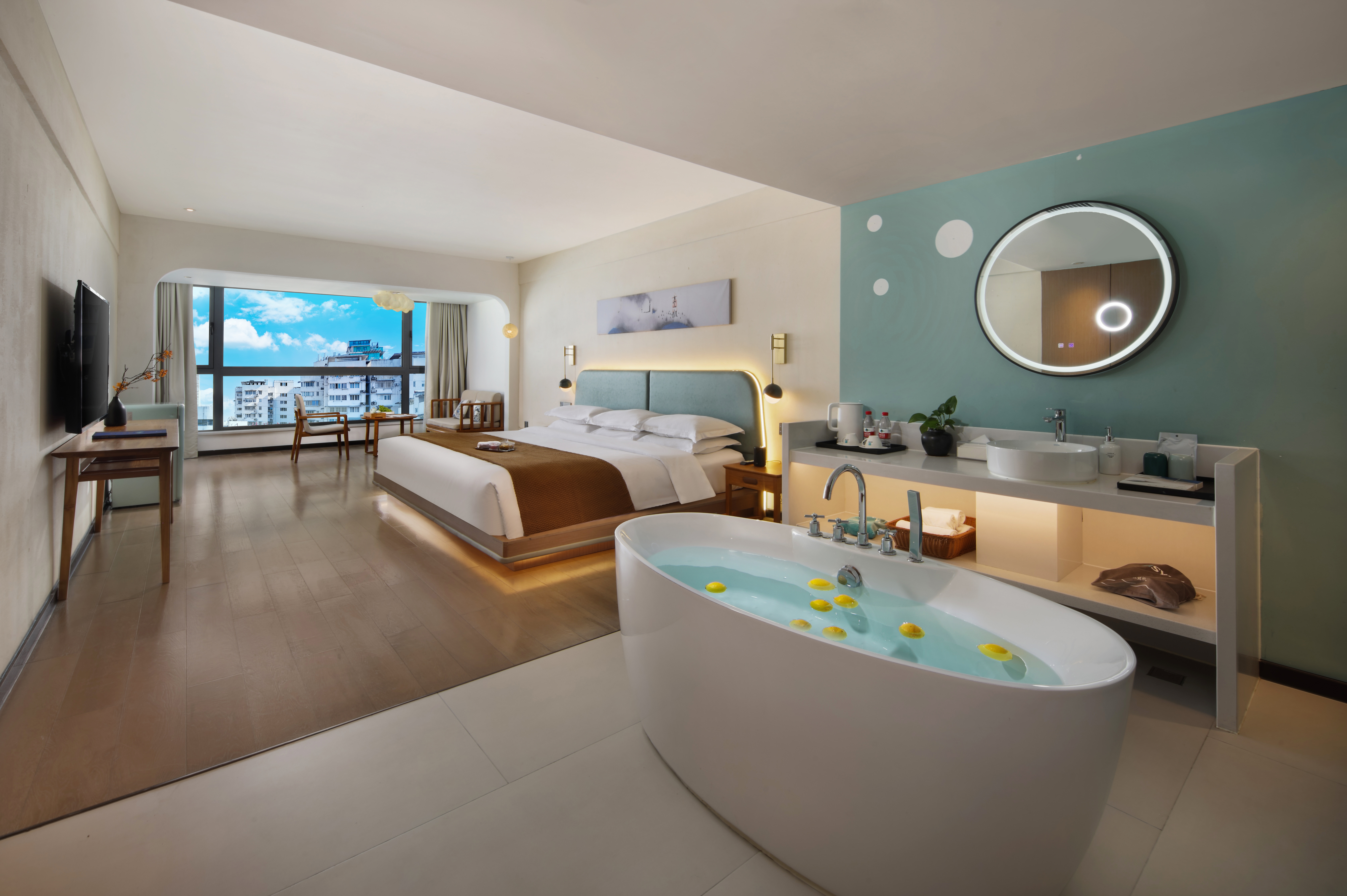 翻滚自由超大床房+50L净味除湿机+舒缓减压浴缸+落地窗