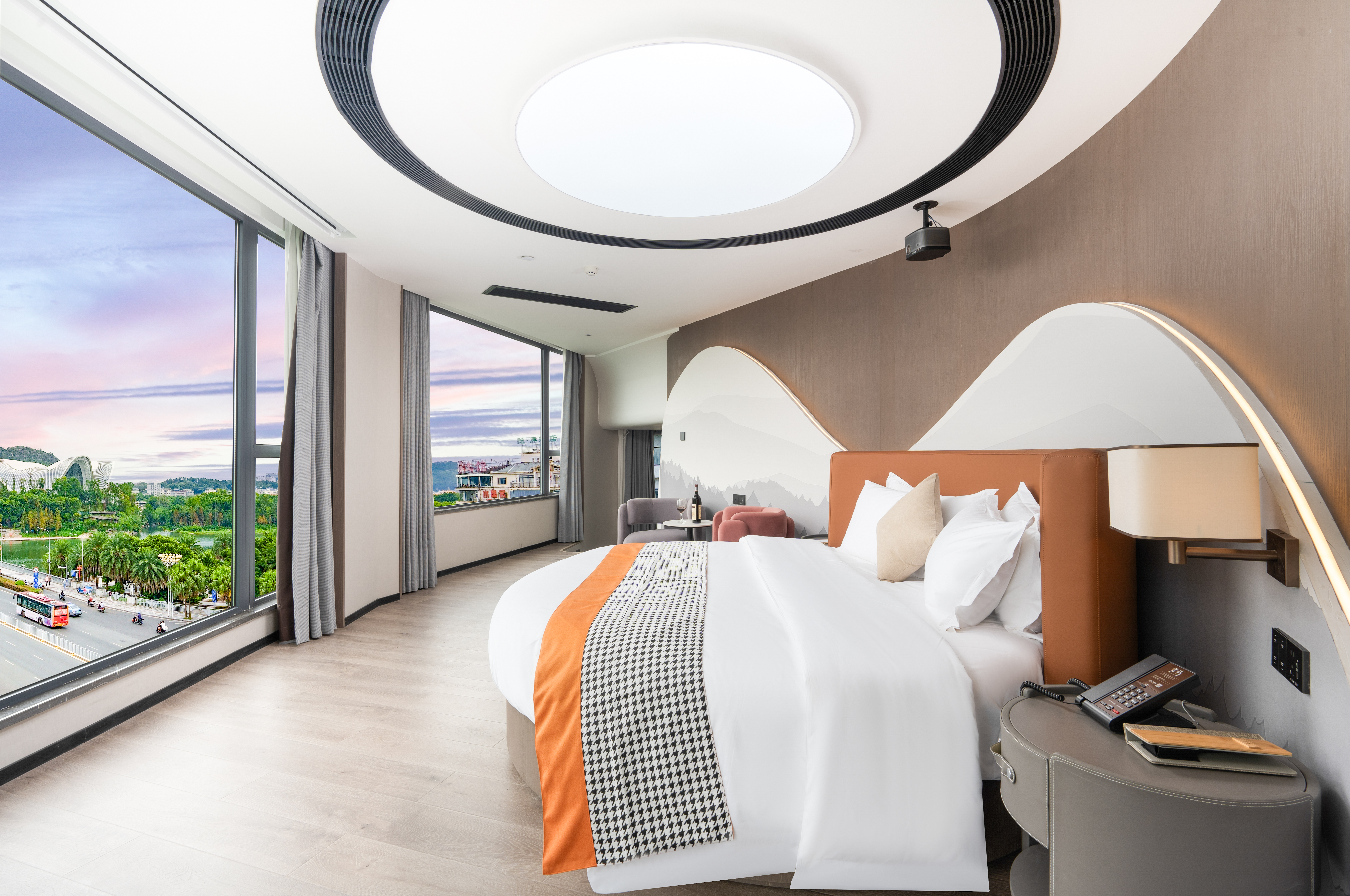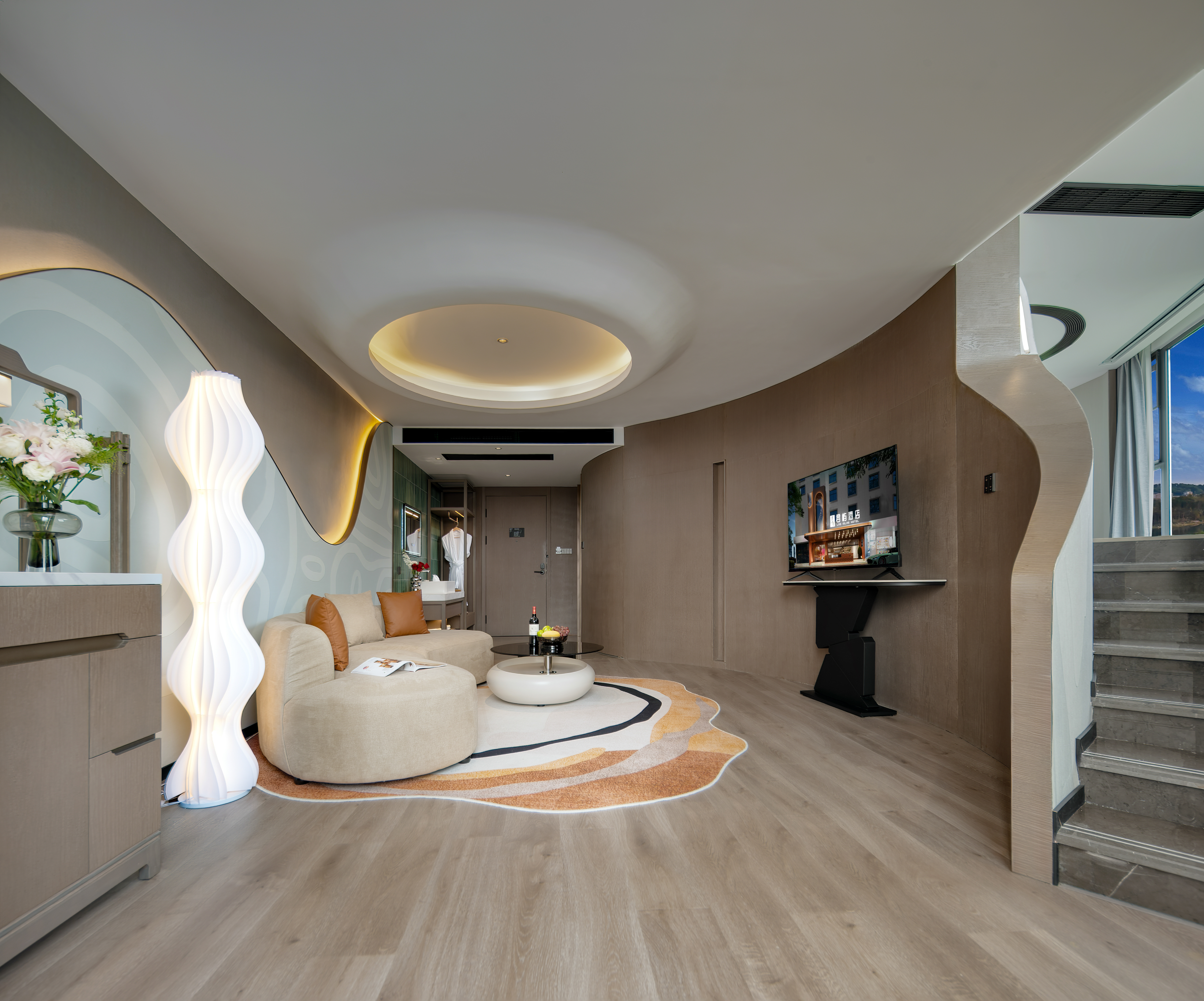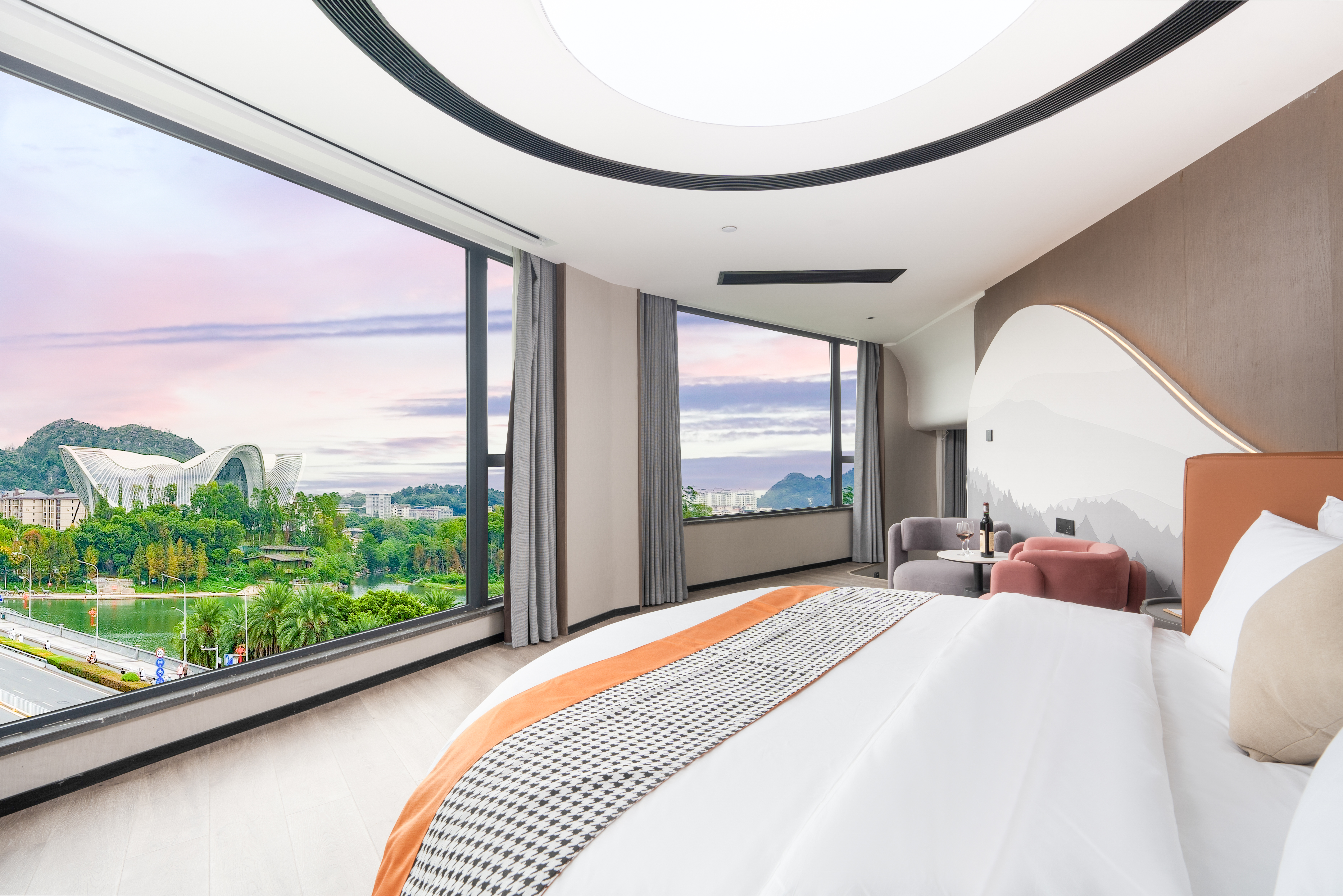 君屿270°loft临水观山圆床套房|别致会客厅+景观浴缸+极米投影