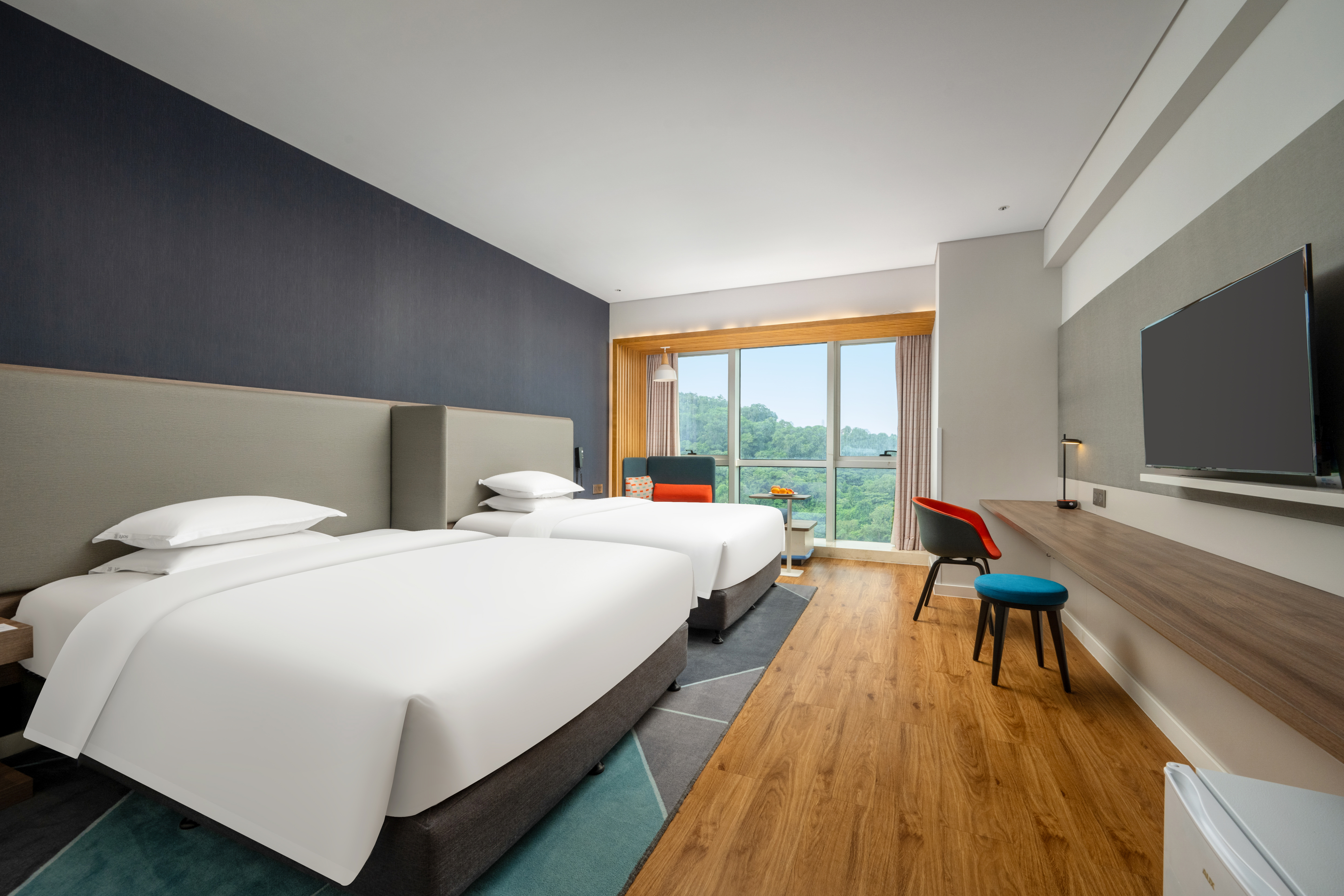 豪华双床房(零压床垫+全景落地窗+小冰箱+休闲沙发)