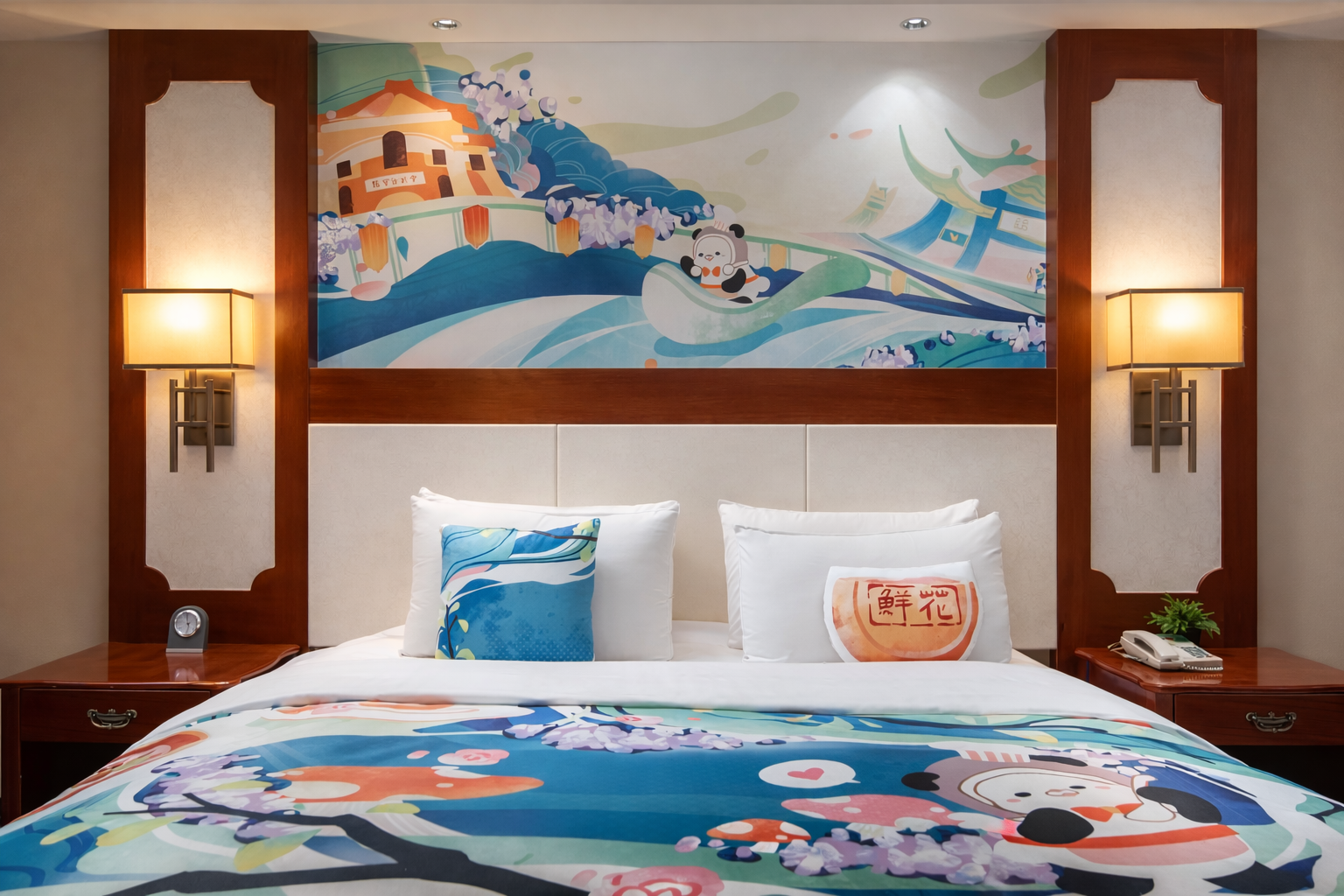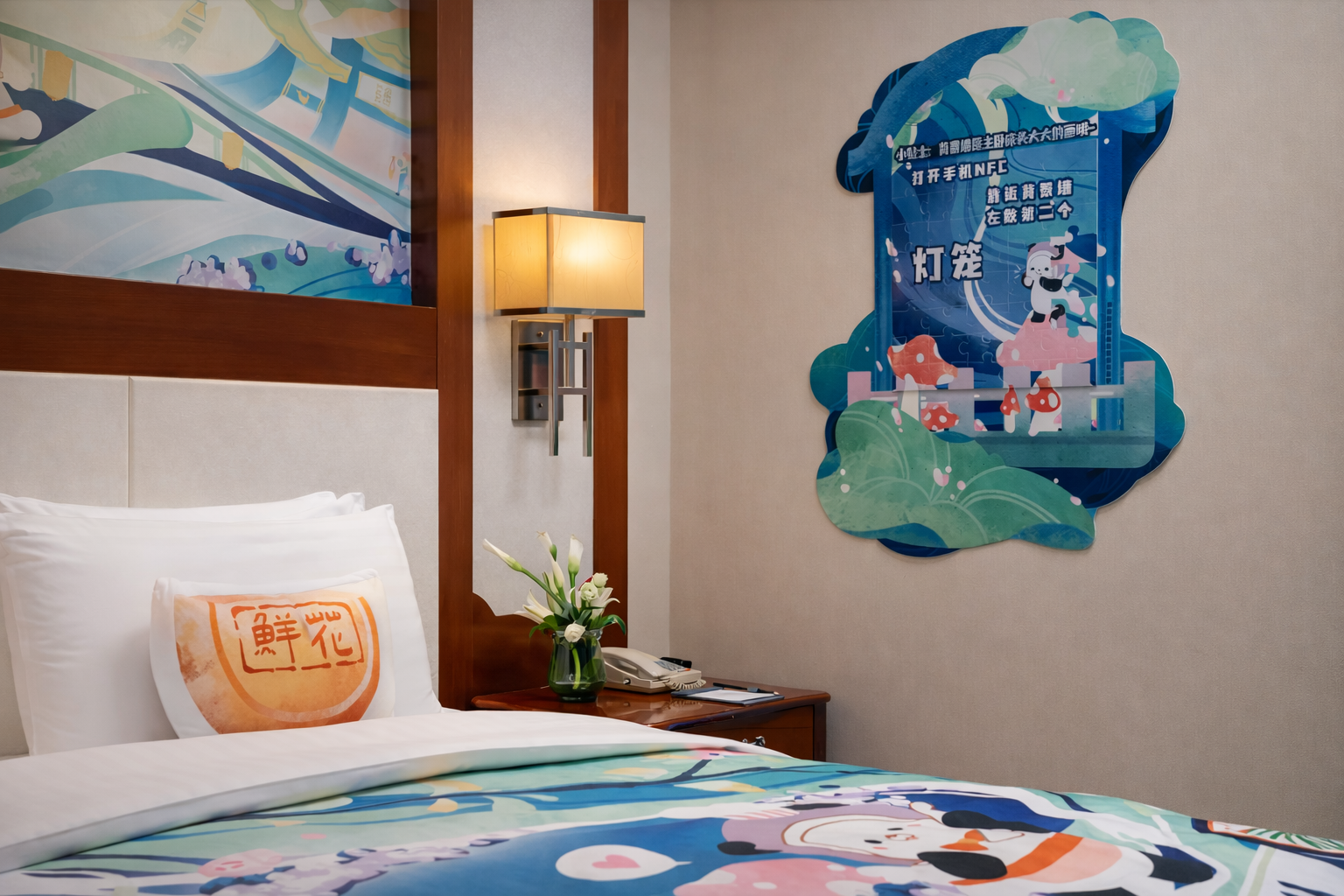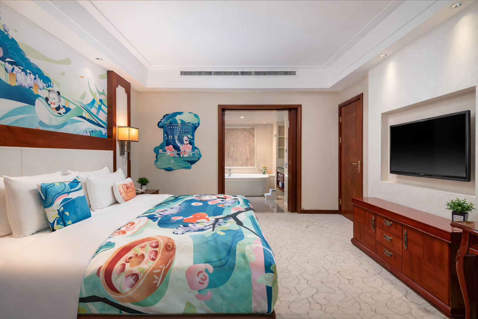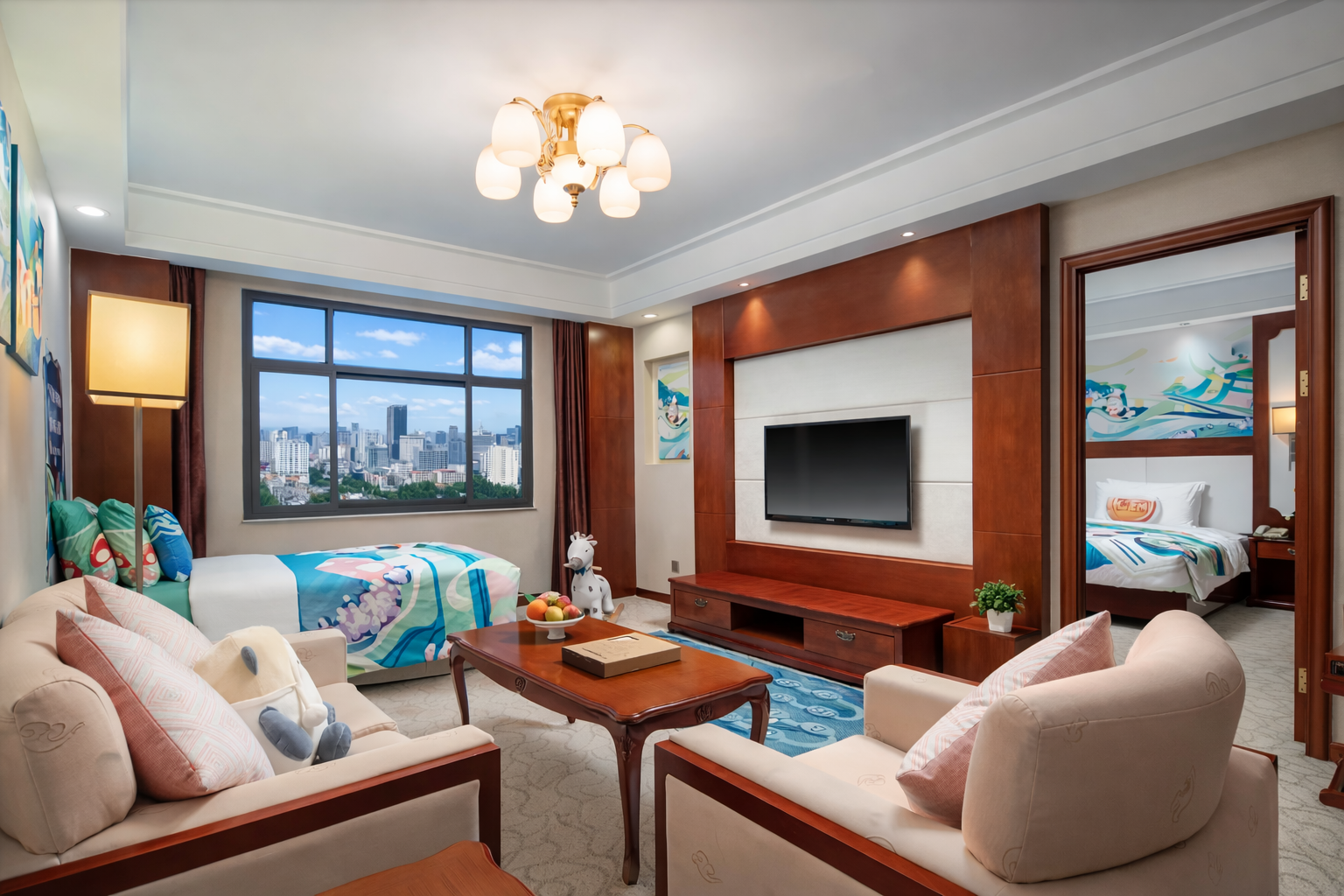 主题亲子套房「可爱趣玩屋+2床1厅+益智积木+欢乐木马」
