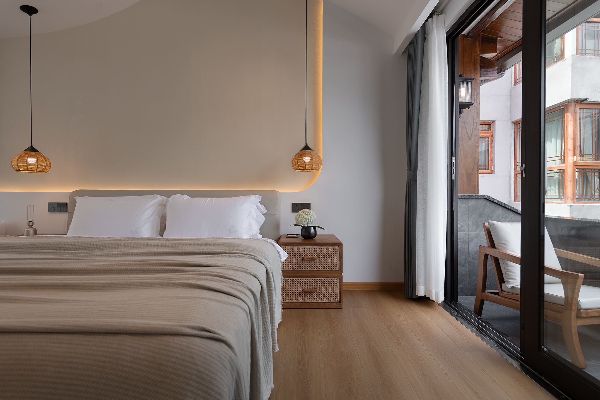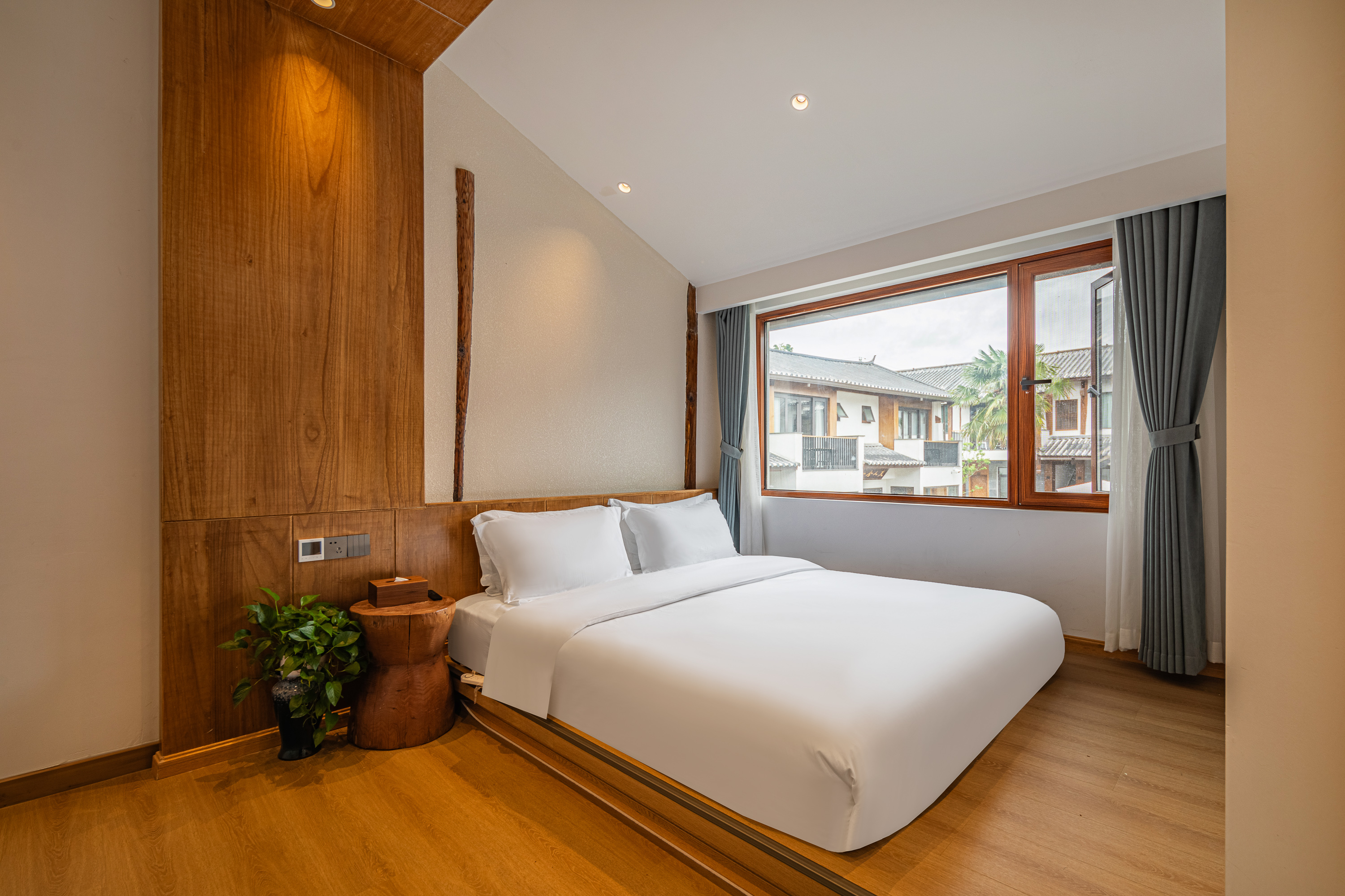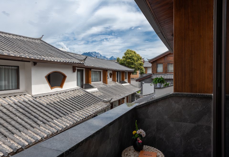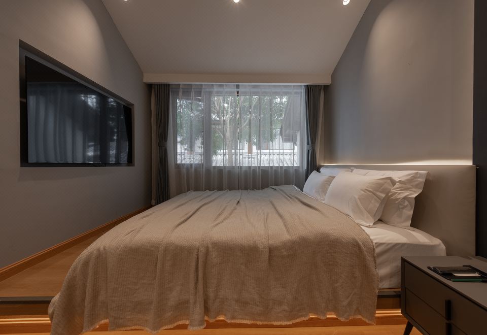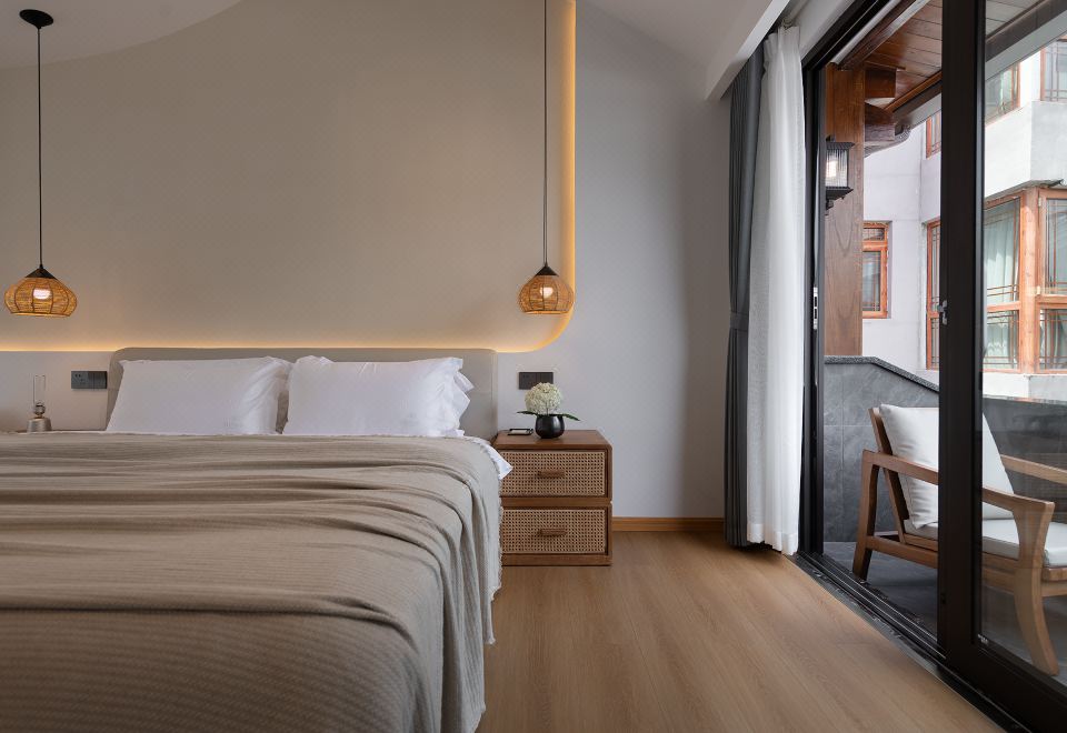 Single Room With A Balcony Overlooking A Swimming Pool And Persimmon Tree Outside The Window