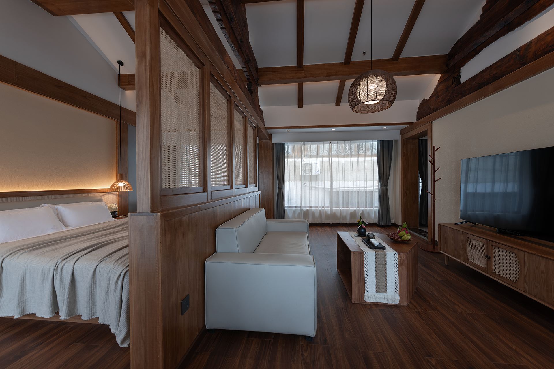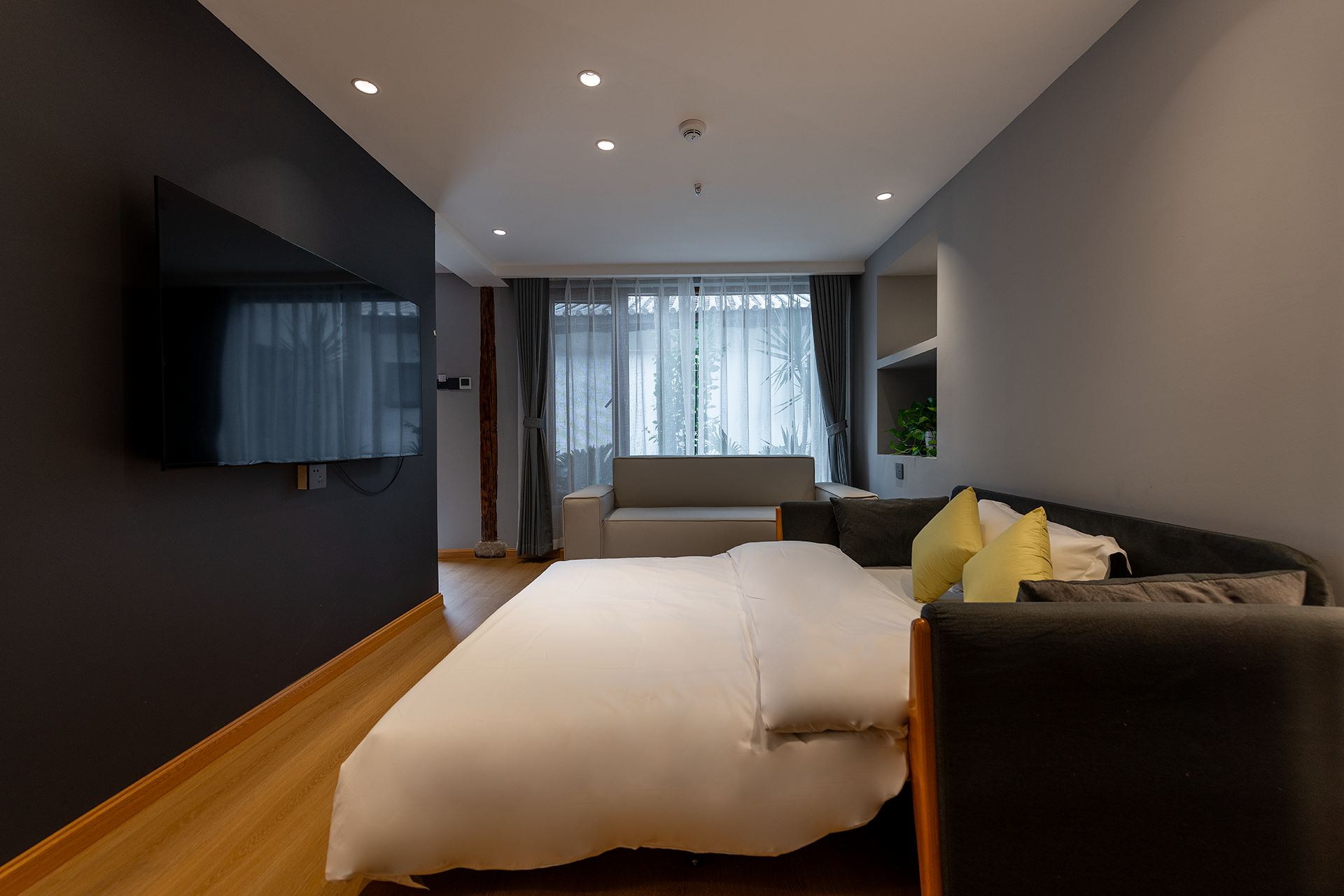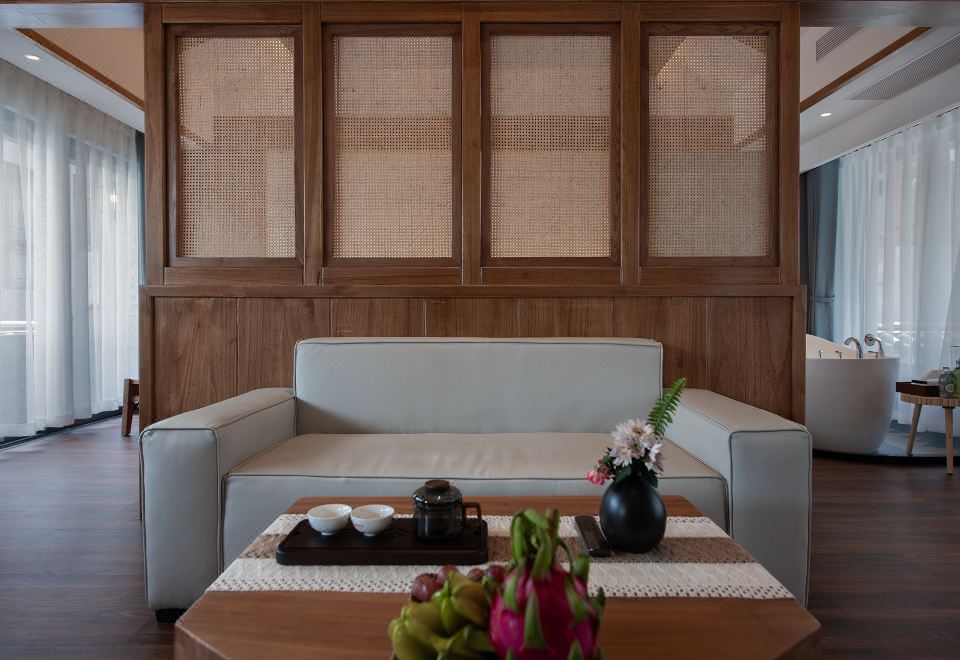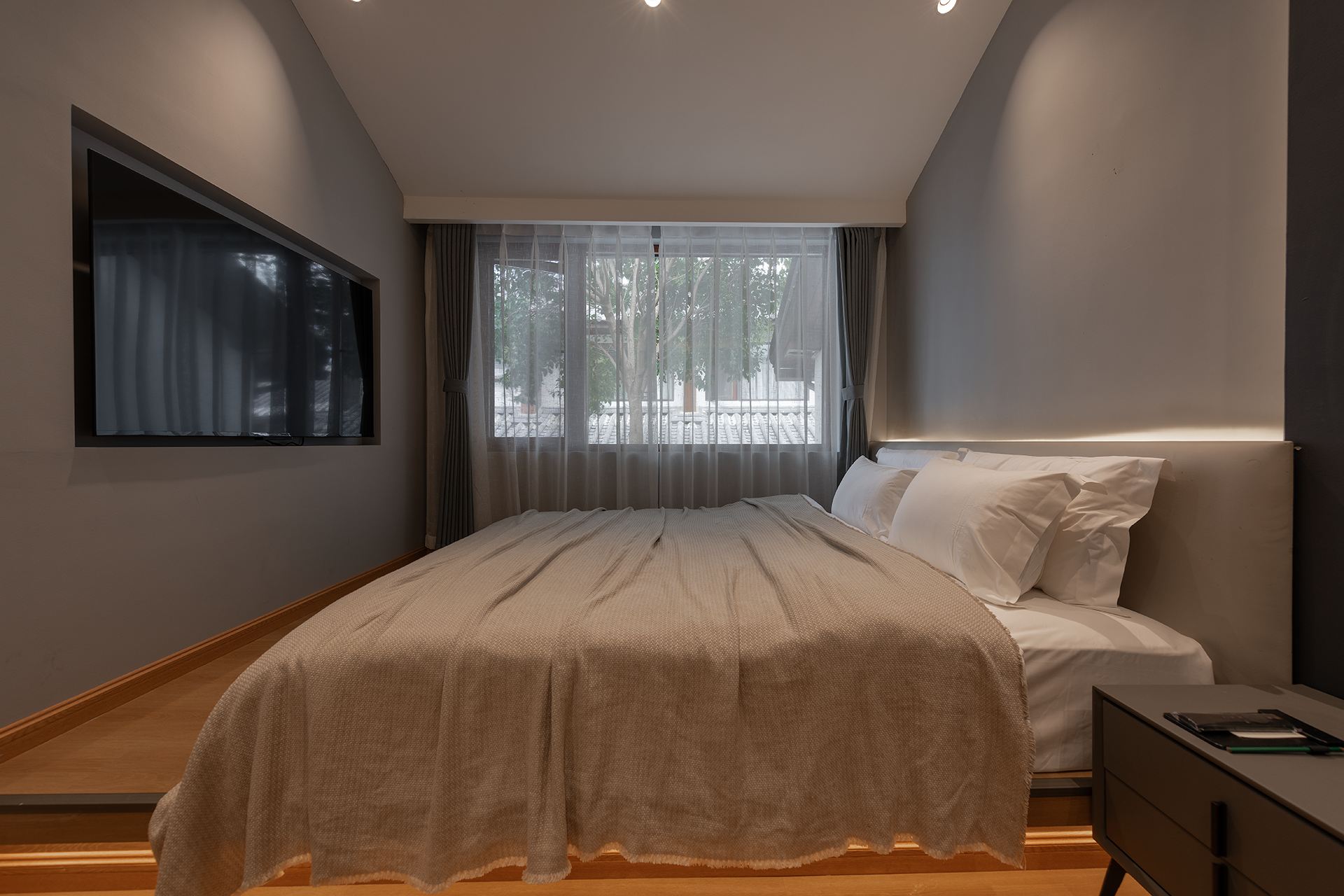 Single Room With A Balcony Overlooking A Swimming Pool And Persimmon Tree Outside The Window