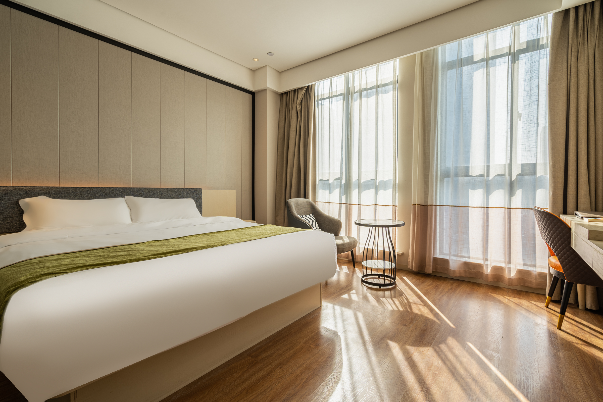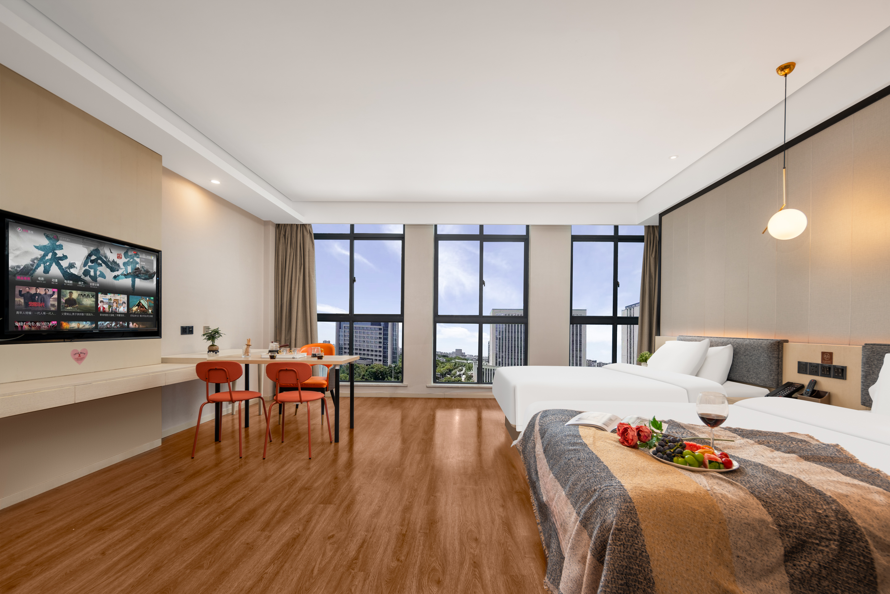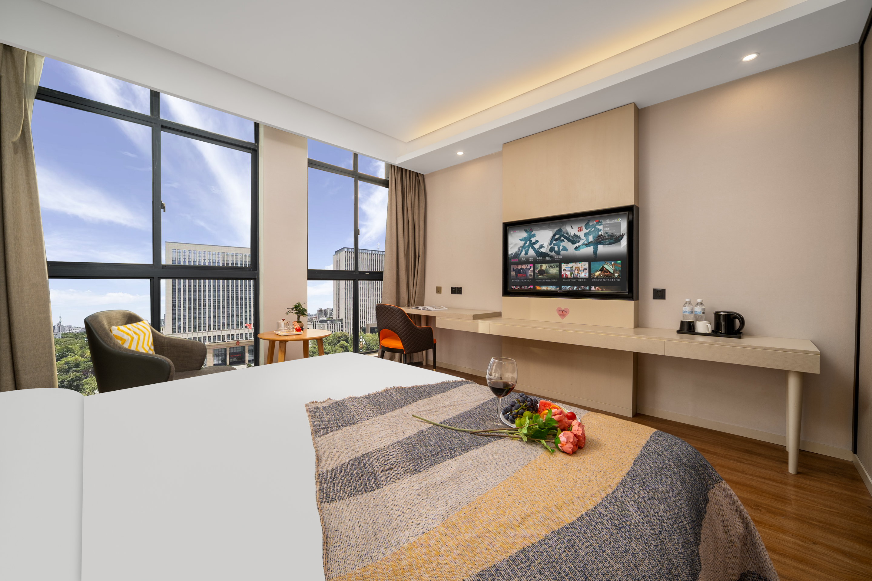 Enjoyable Sunshine Double Bed Room (Premium Tea Set + Tea Table + 55-Inch Projector Tv + Latex Mattress + Blackout Curtains)