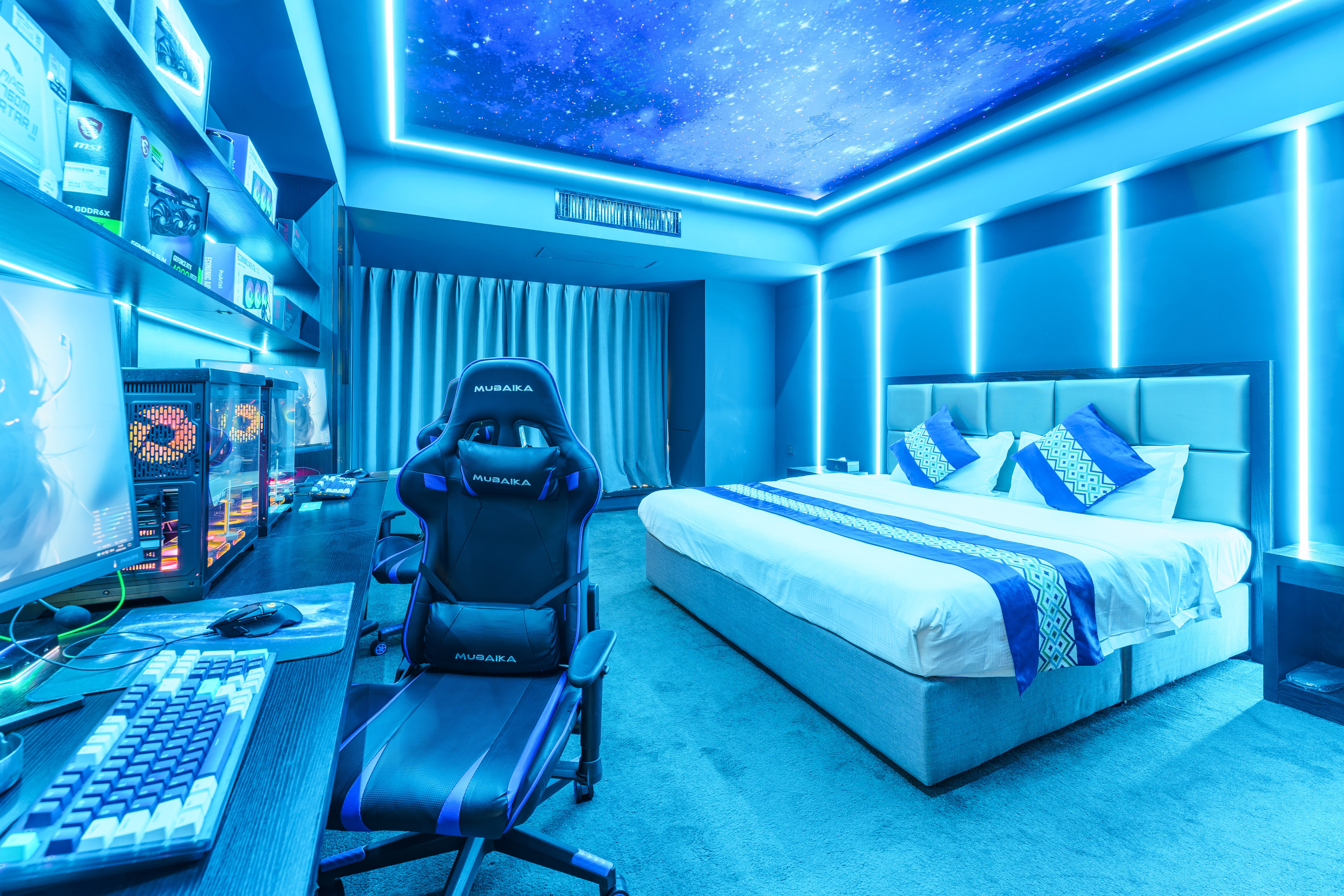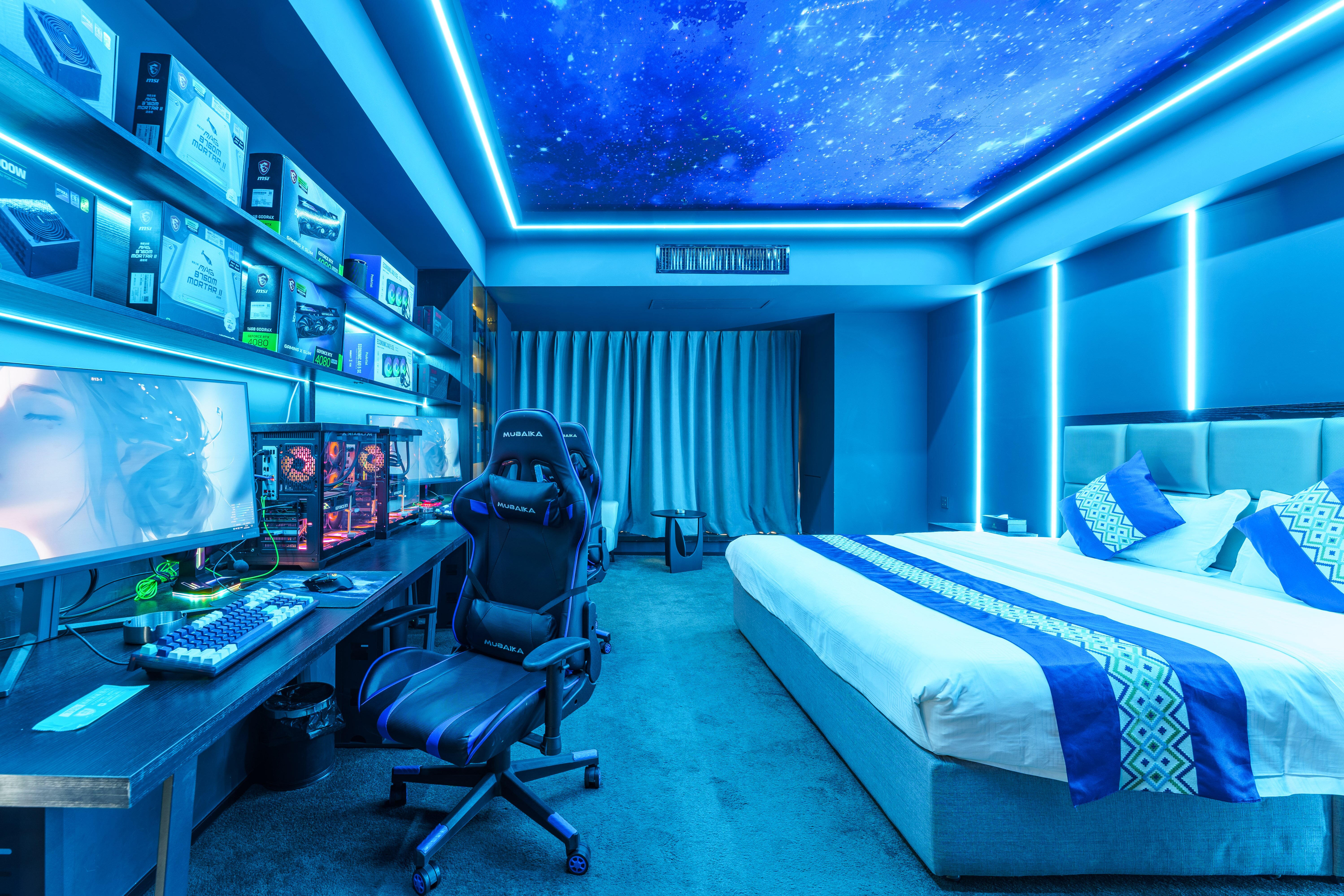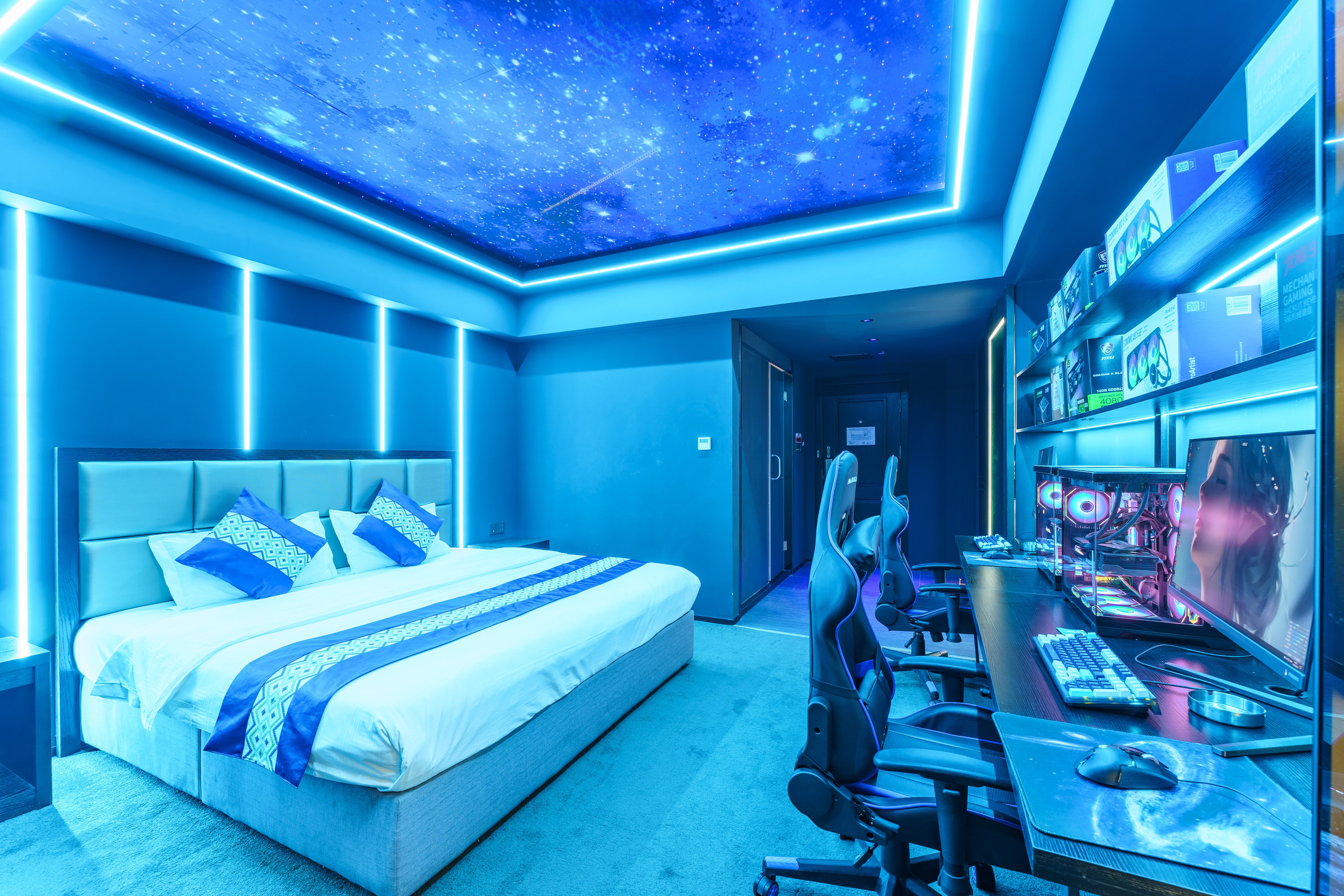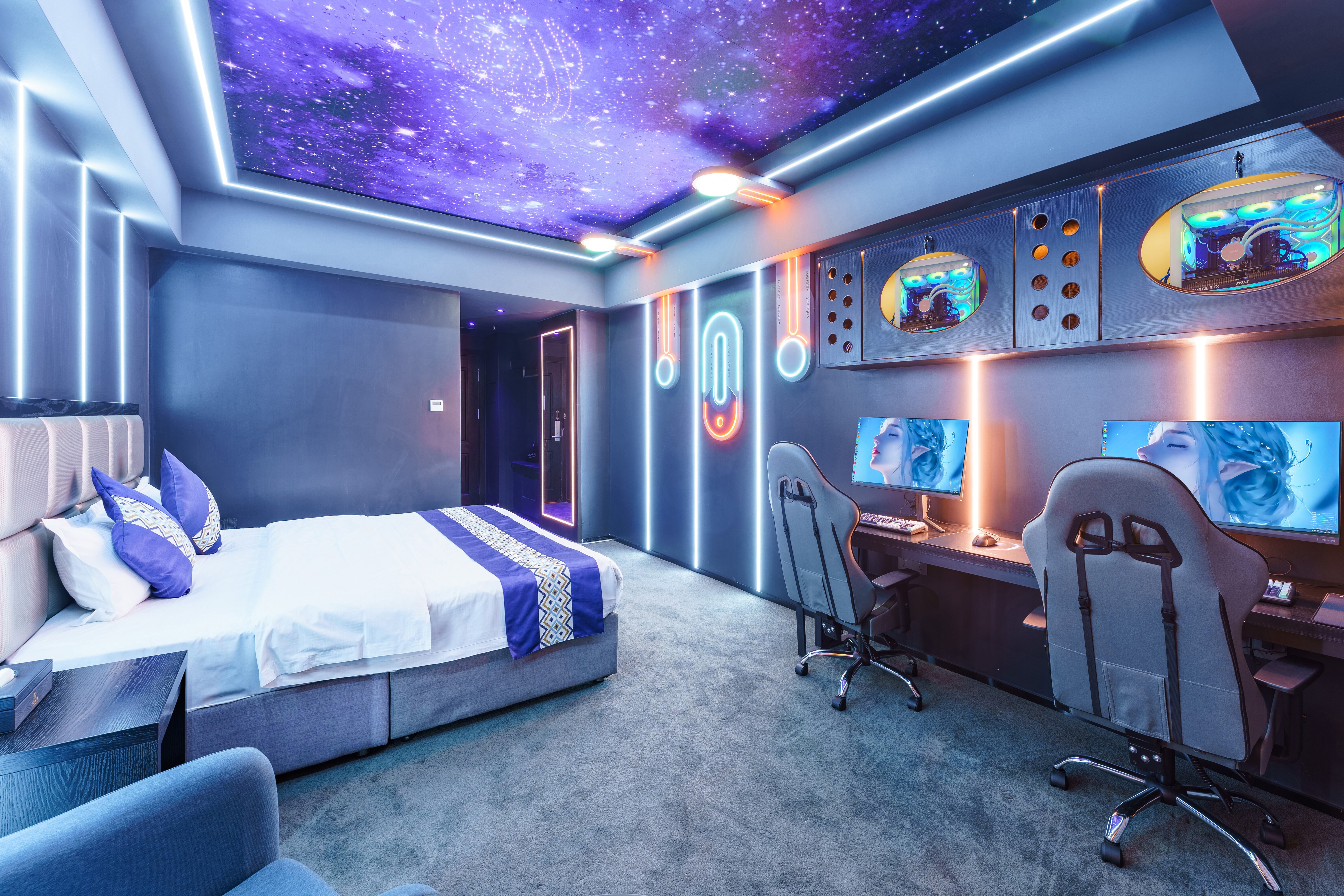 情侶星空探祕大床電競房(RTX4080S顯卡+i7-13700KF處理器+27寸飛利浦2K240Hz顯示器+32G內存+腹靈光魔980鍵盤+羅技鼠標+雷蛇耳麥)