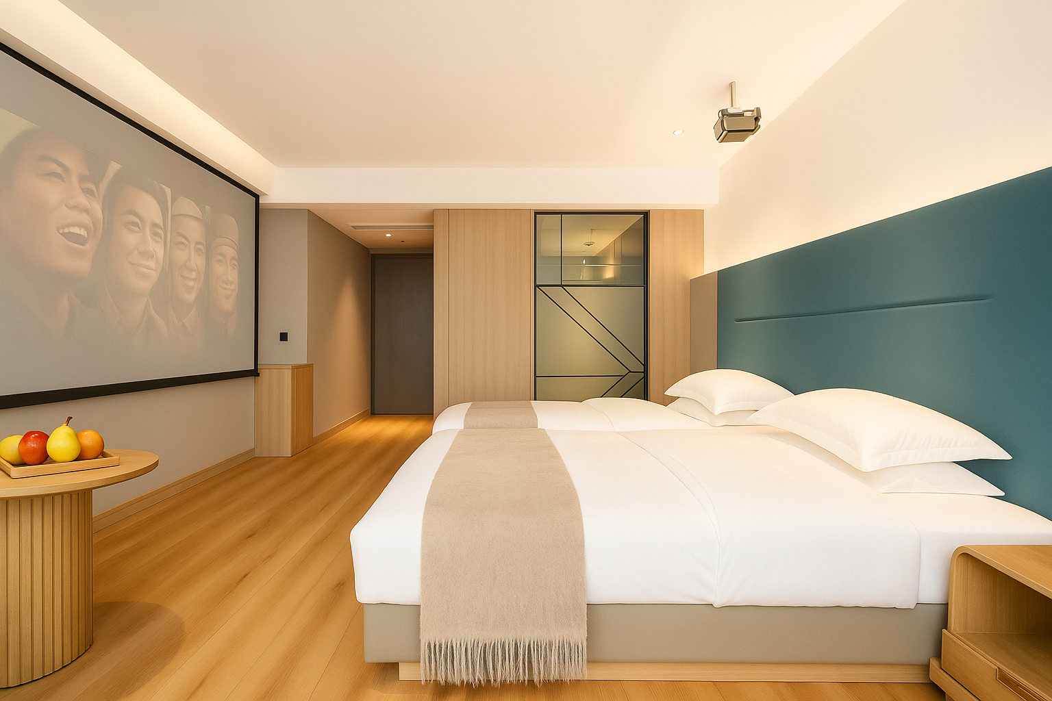 肆意丨投影双床房「100寸光学变焦坚果投影+慢回弹床垫」
