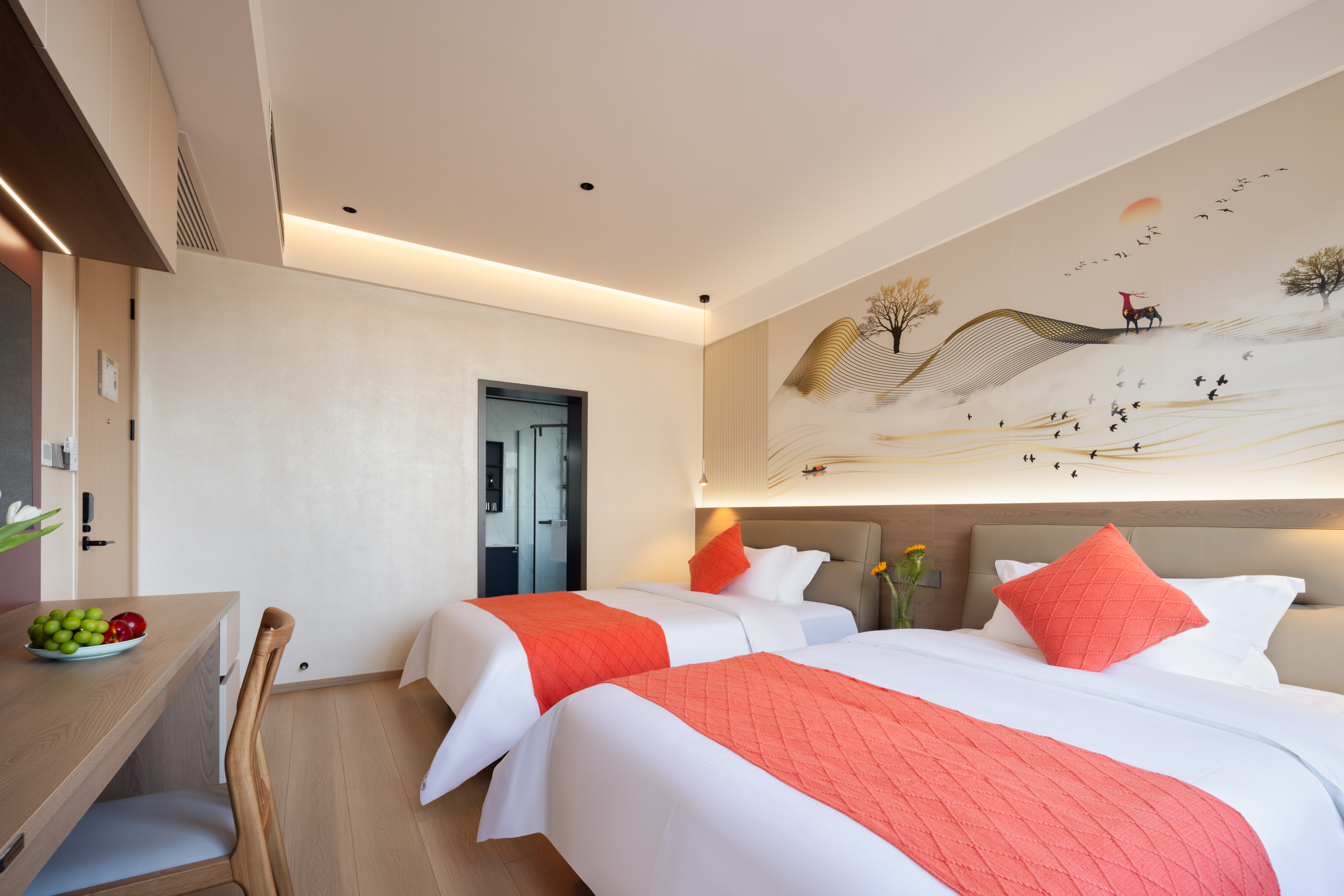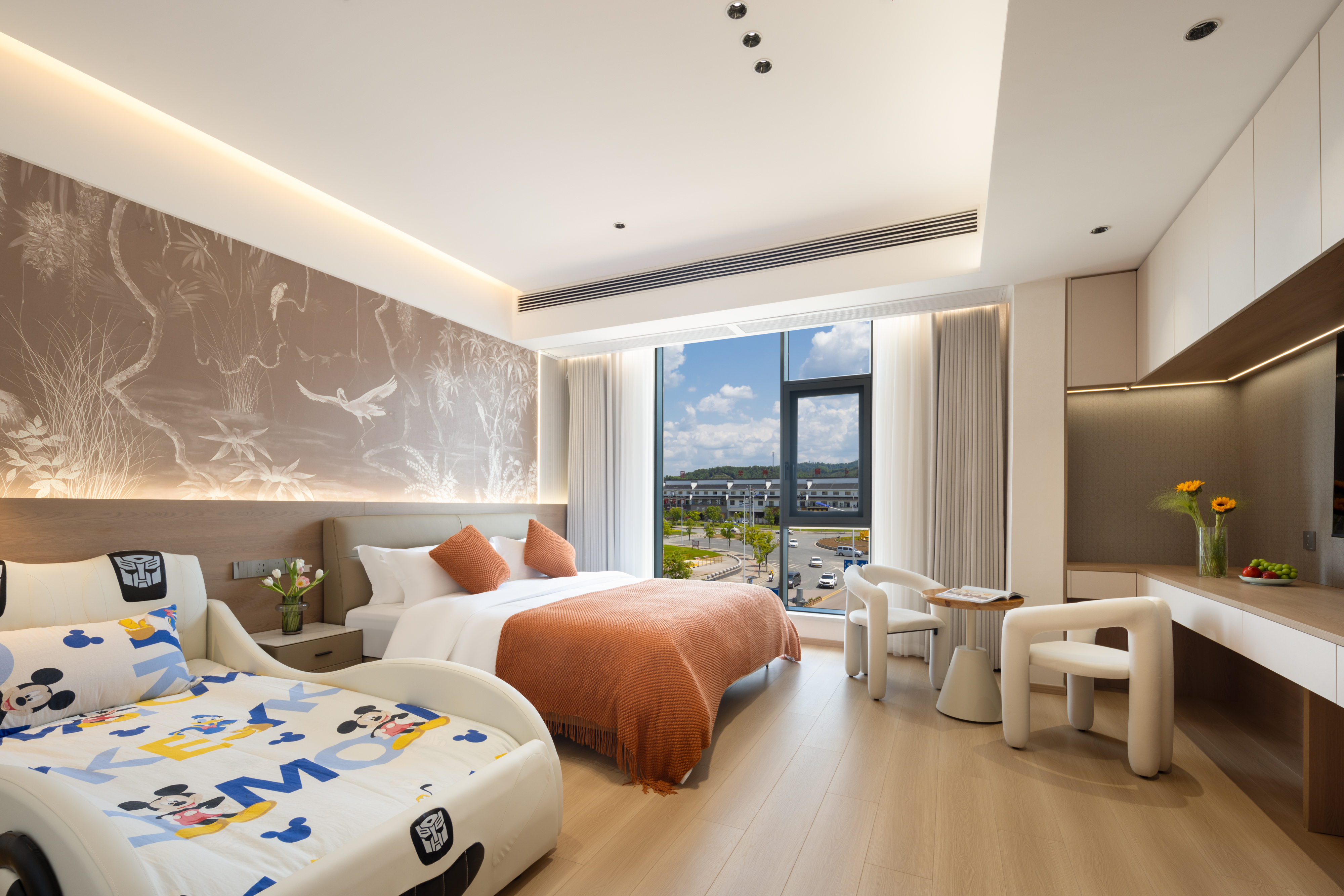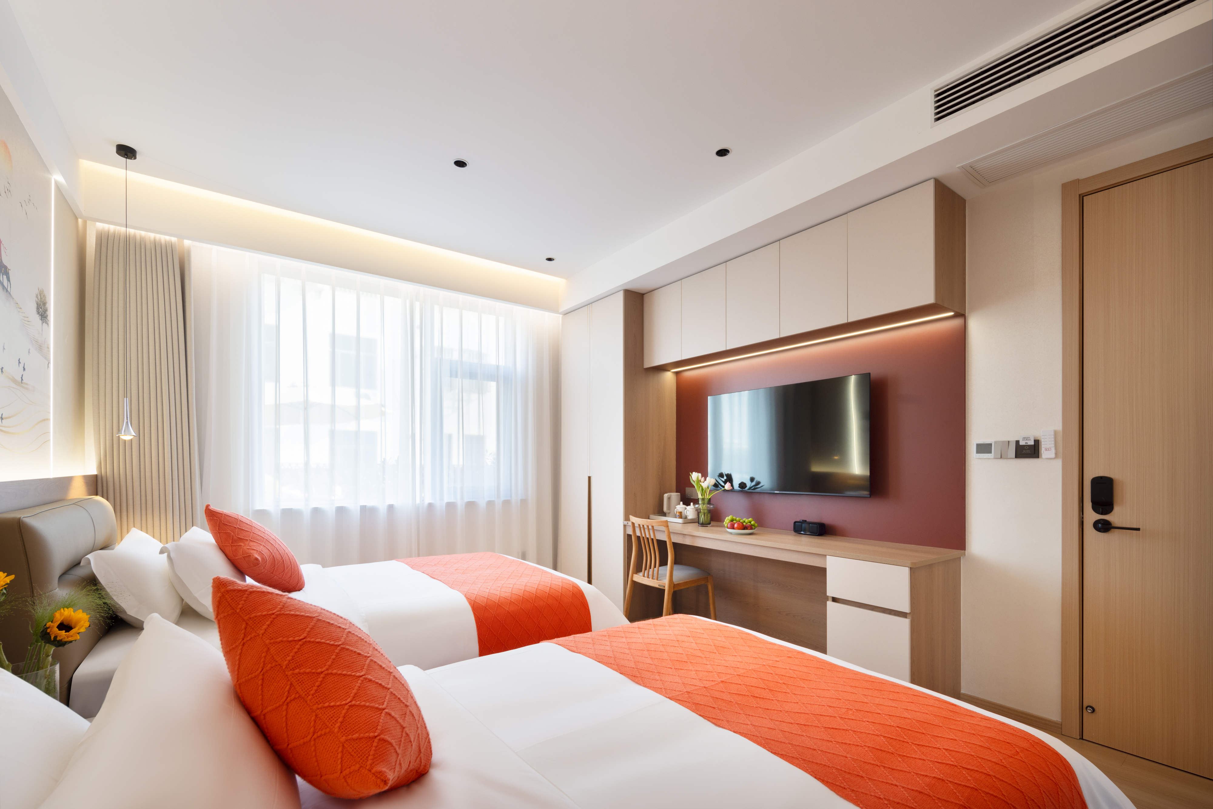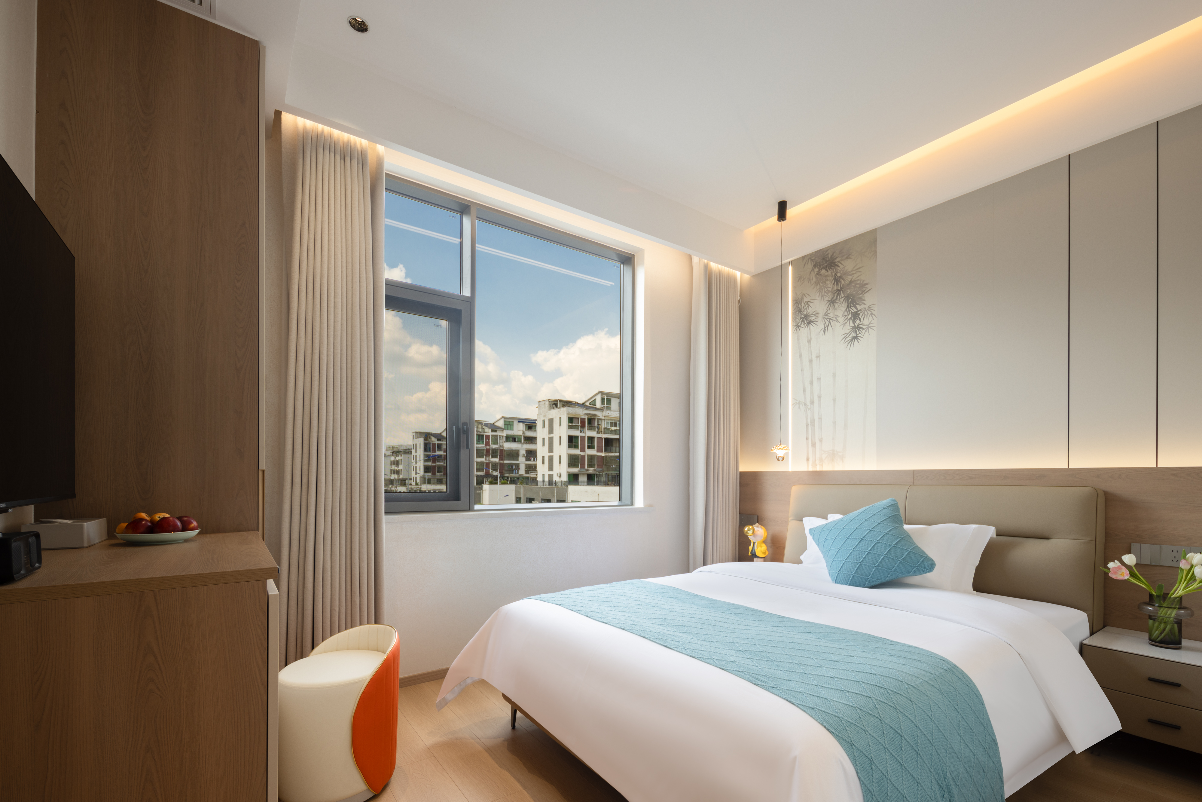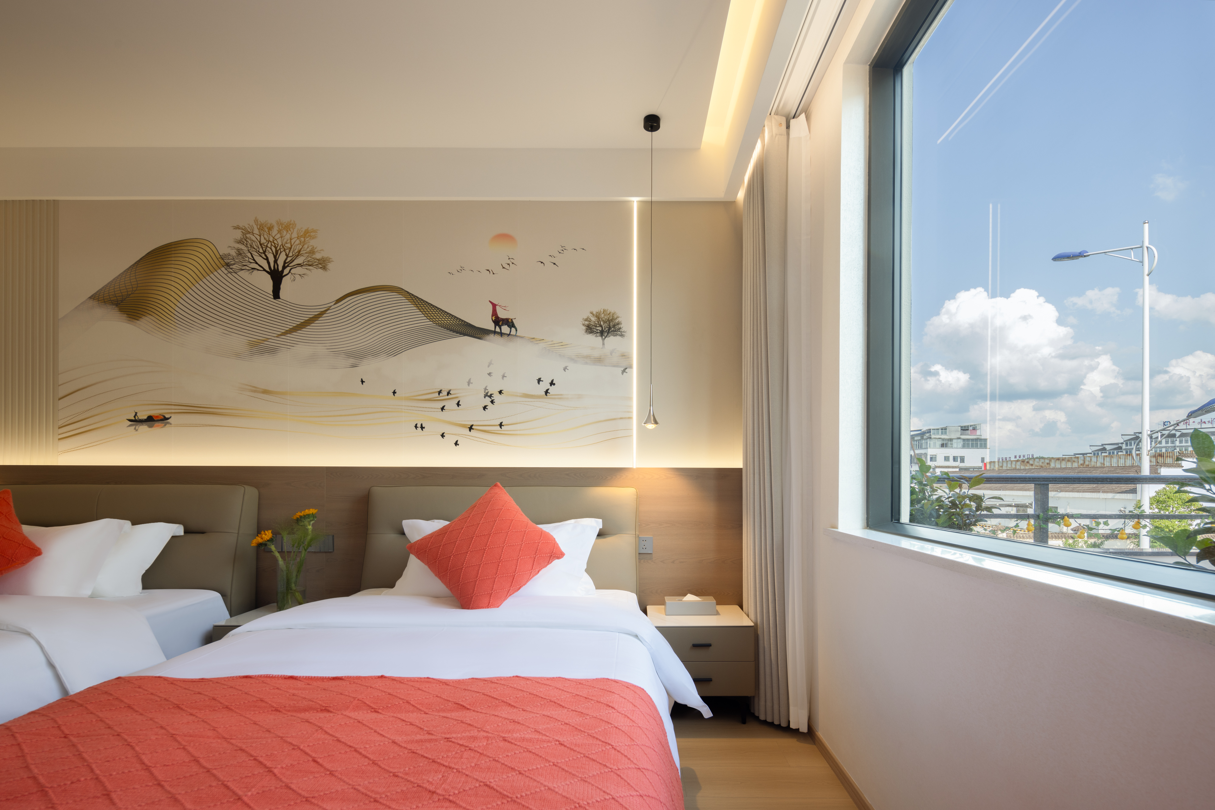 Qi Yun City-View Twin Room | Smart Guest Control + 55-Inch Tv + Branded Genuine Leather Bed + Latex Mattress