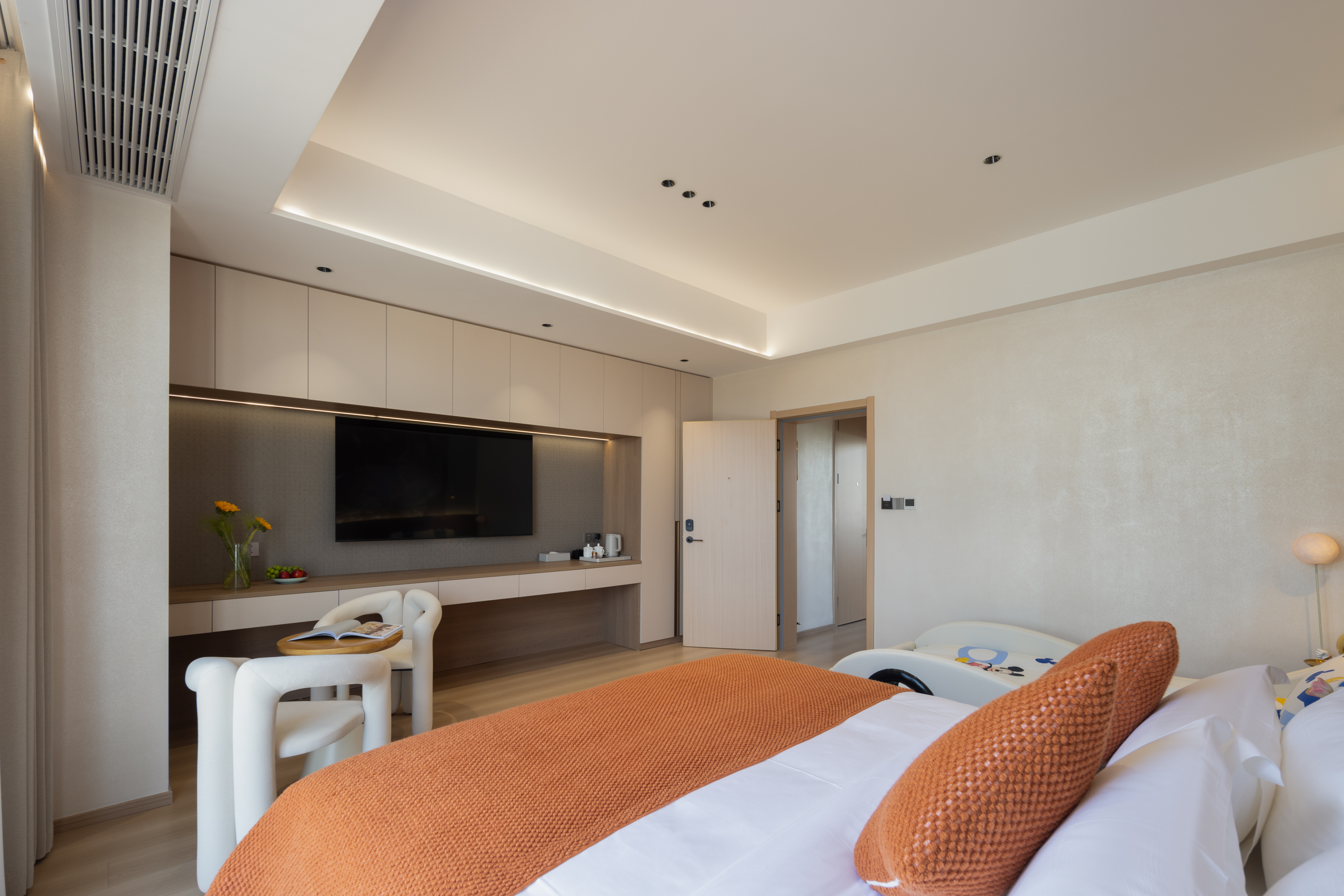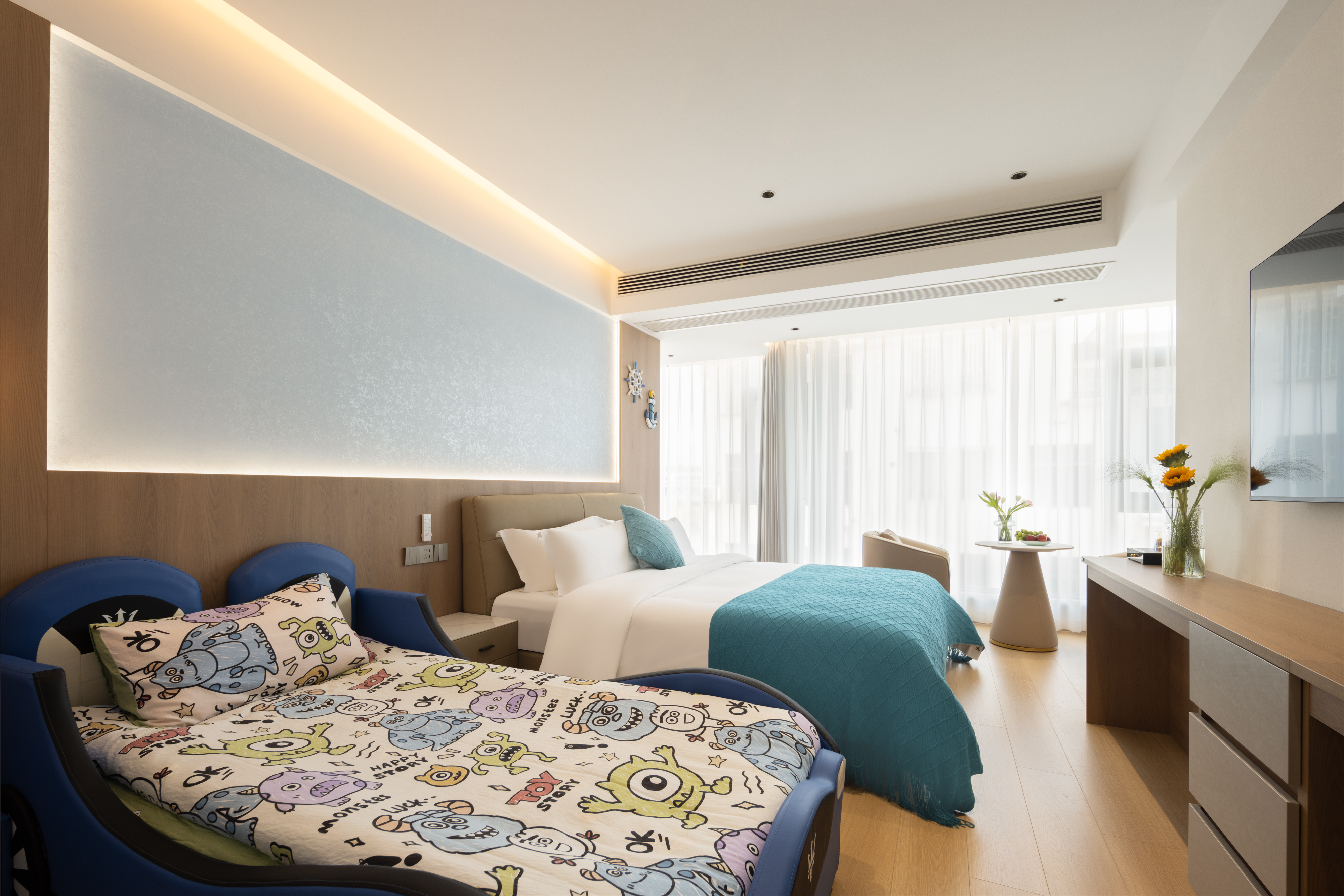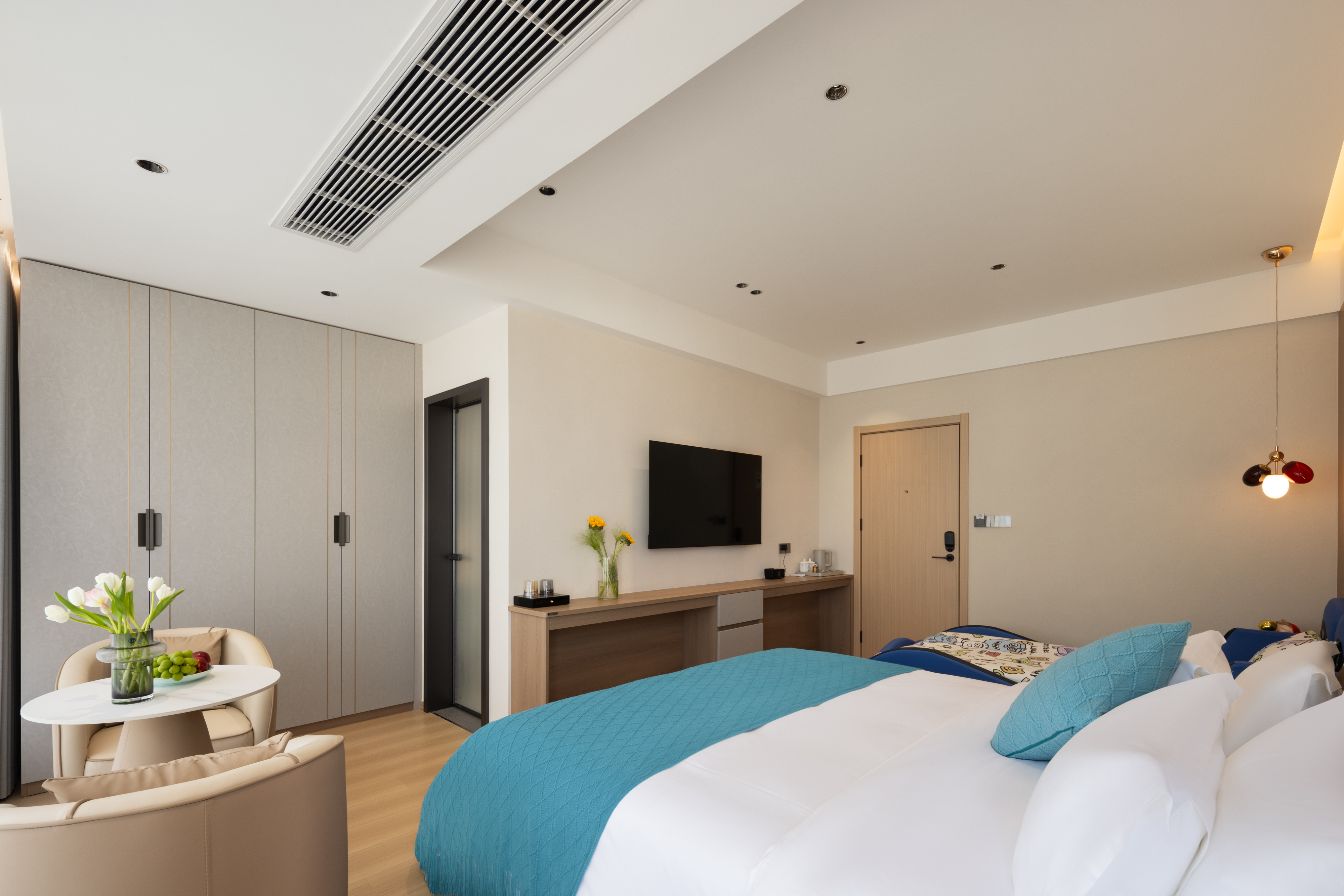 Qi Ya Family Triple Bed Suite | 65-Inch Tv + Two Separate Rooms + Branded Genuine Leather Bed + Latex Mattress + Smart Guest Control