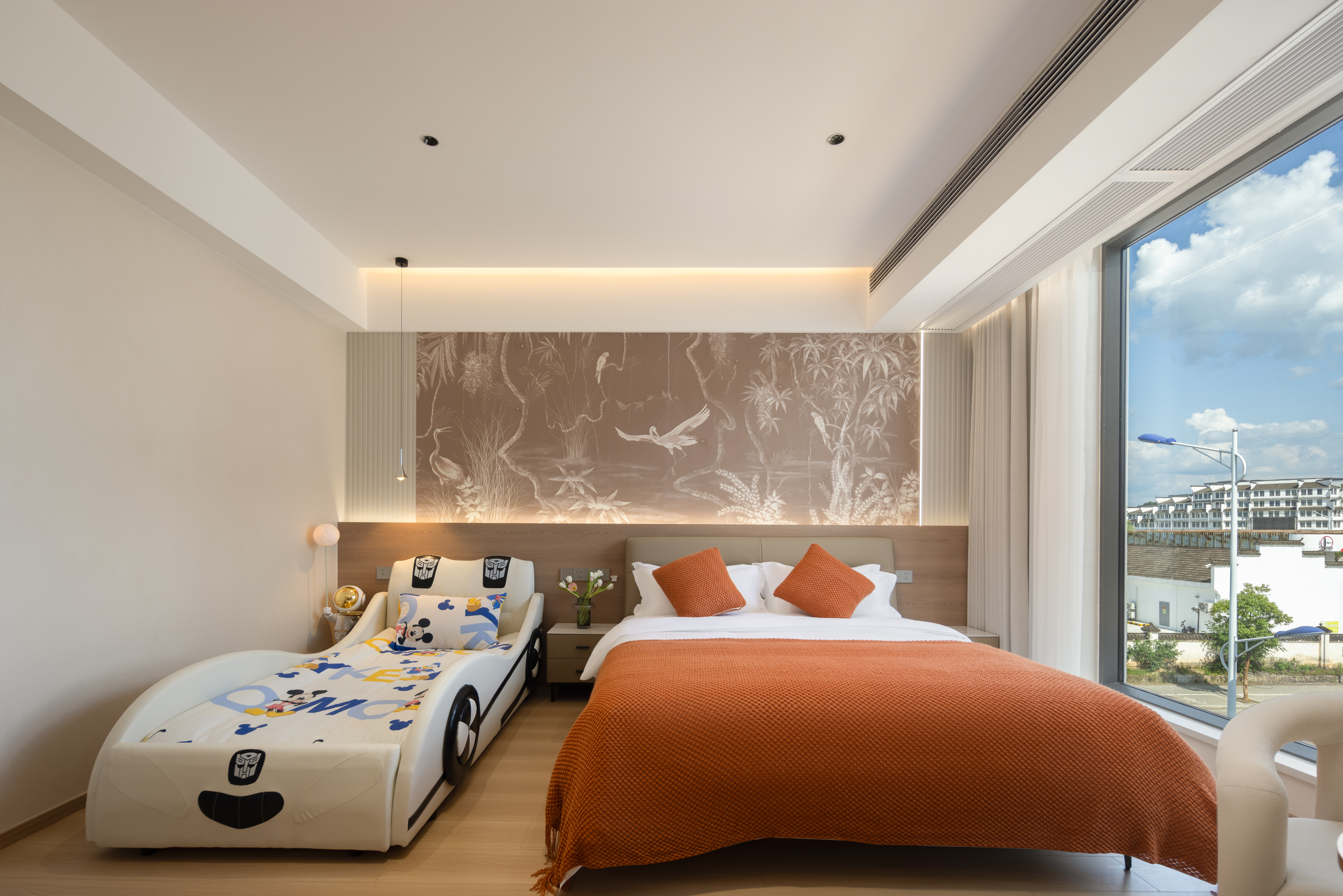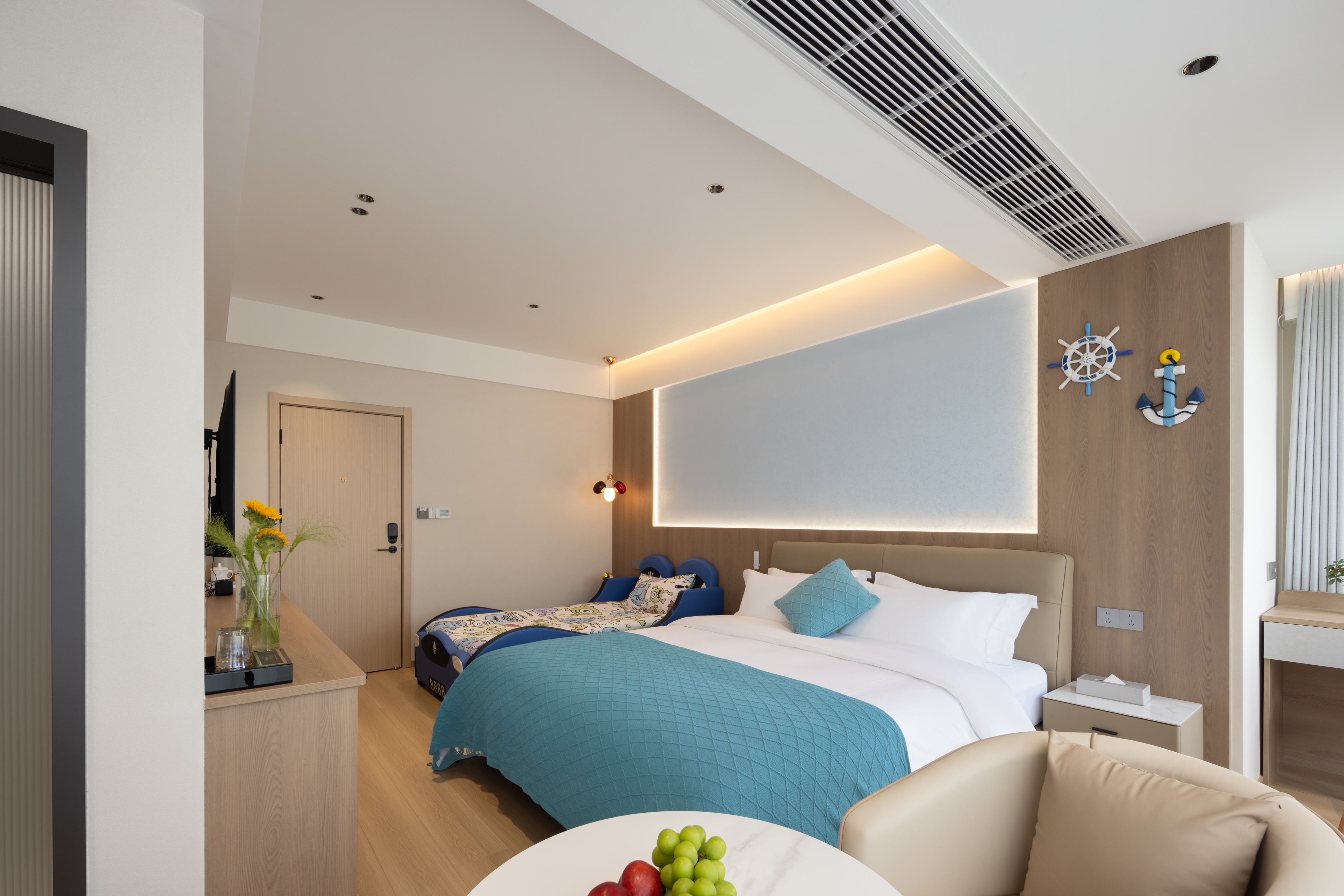 Qiyue Cozy Family Room With Car-Shaped Bed, Latex Mattress, And Smart Guest Control (55-Inch Tv)