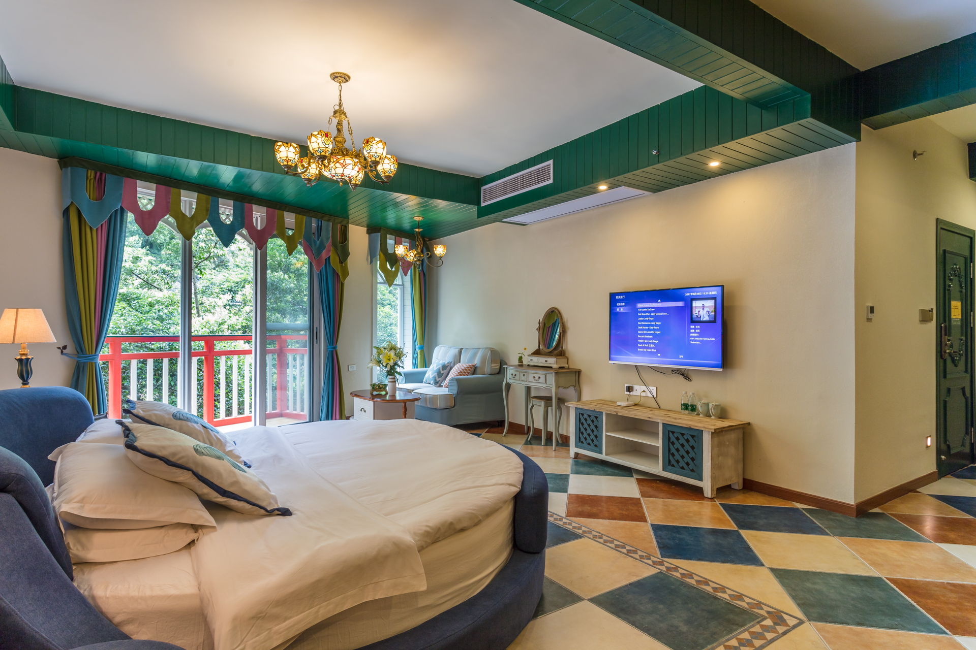 美式山景圆床房~阳台~浴缸