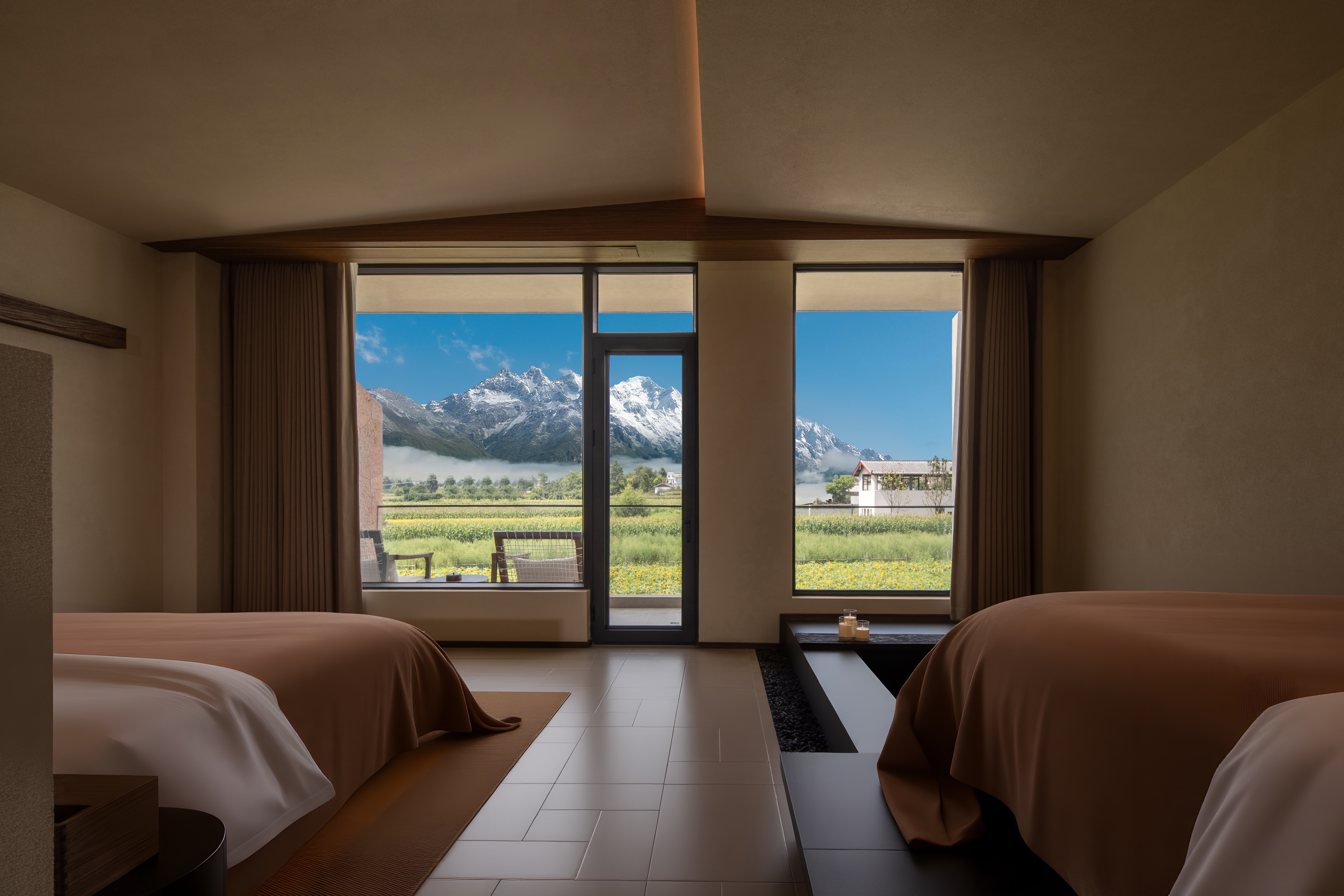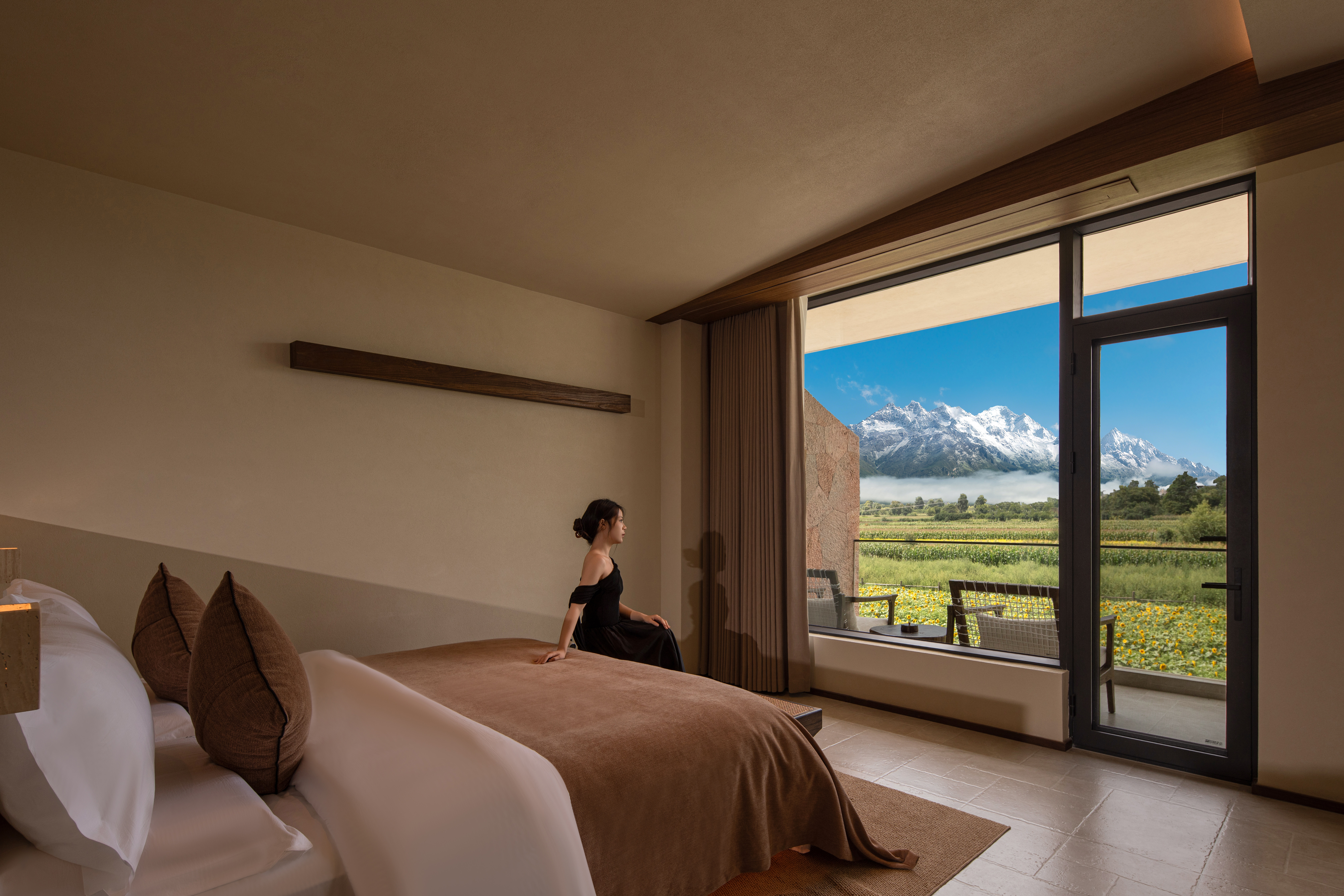 沐曦|180°全景雪山浅池露台大床房|供氧机+地暖+科勒
