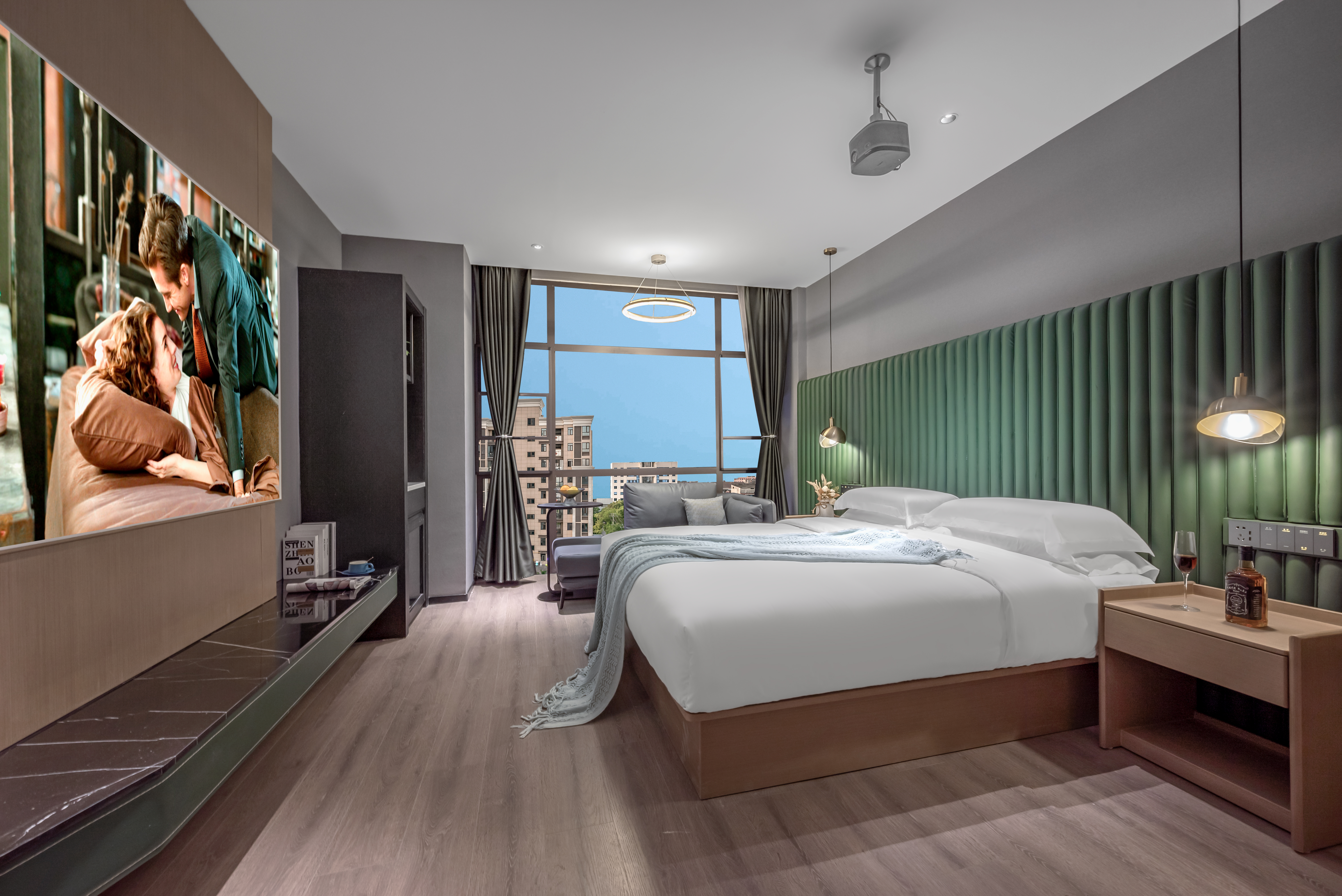 初遇?影院大床房-巨幕投影+恒温加湿器+智能影音+乳胶床垫+3.0日立新风系统+足浴桶