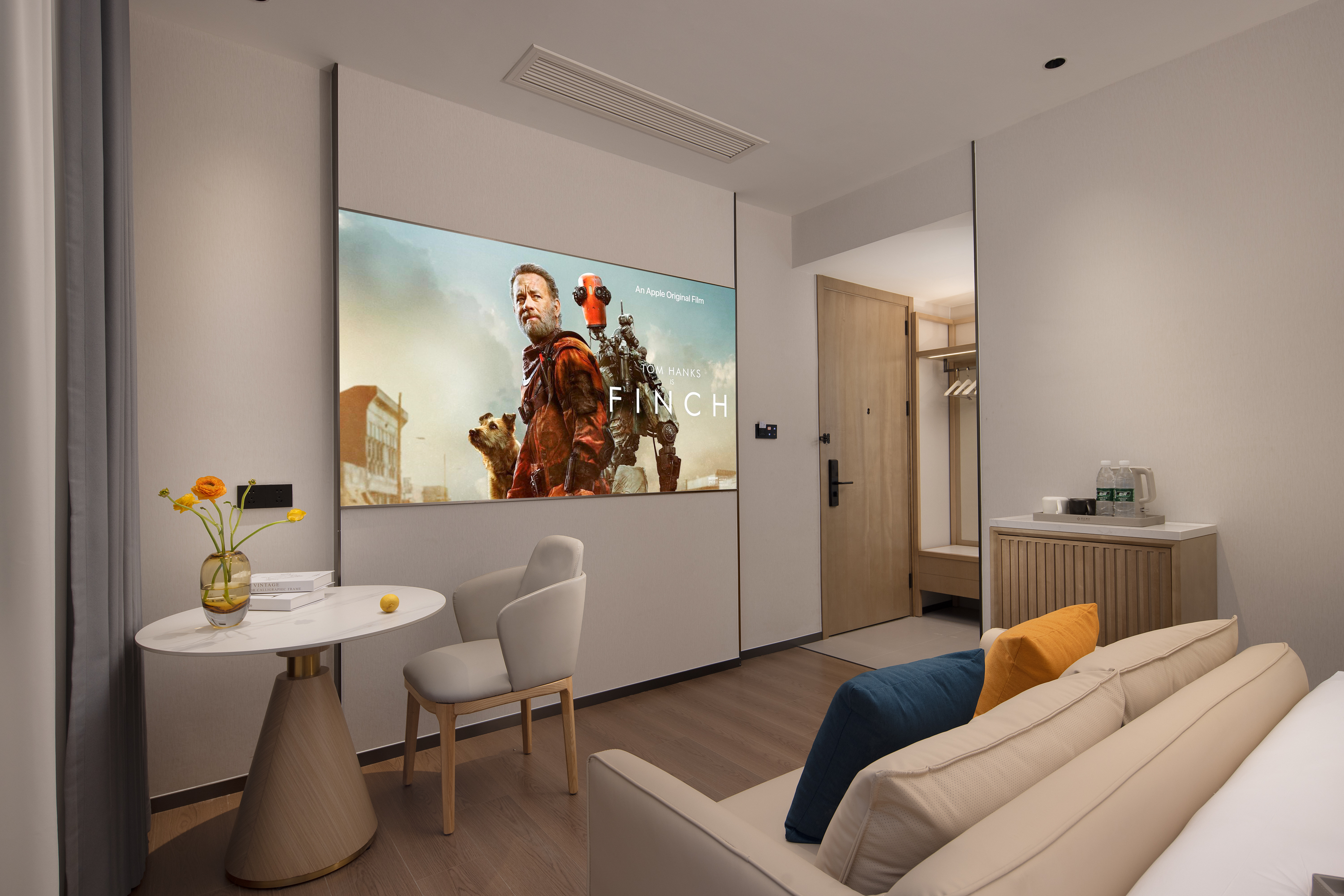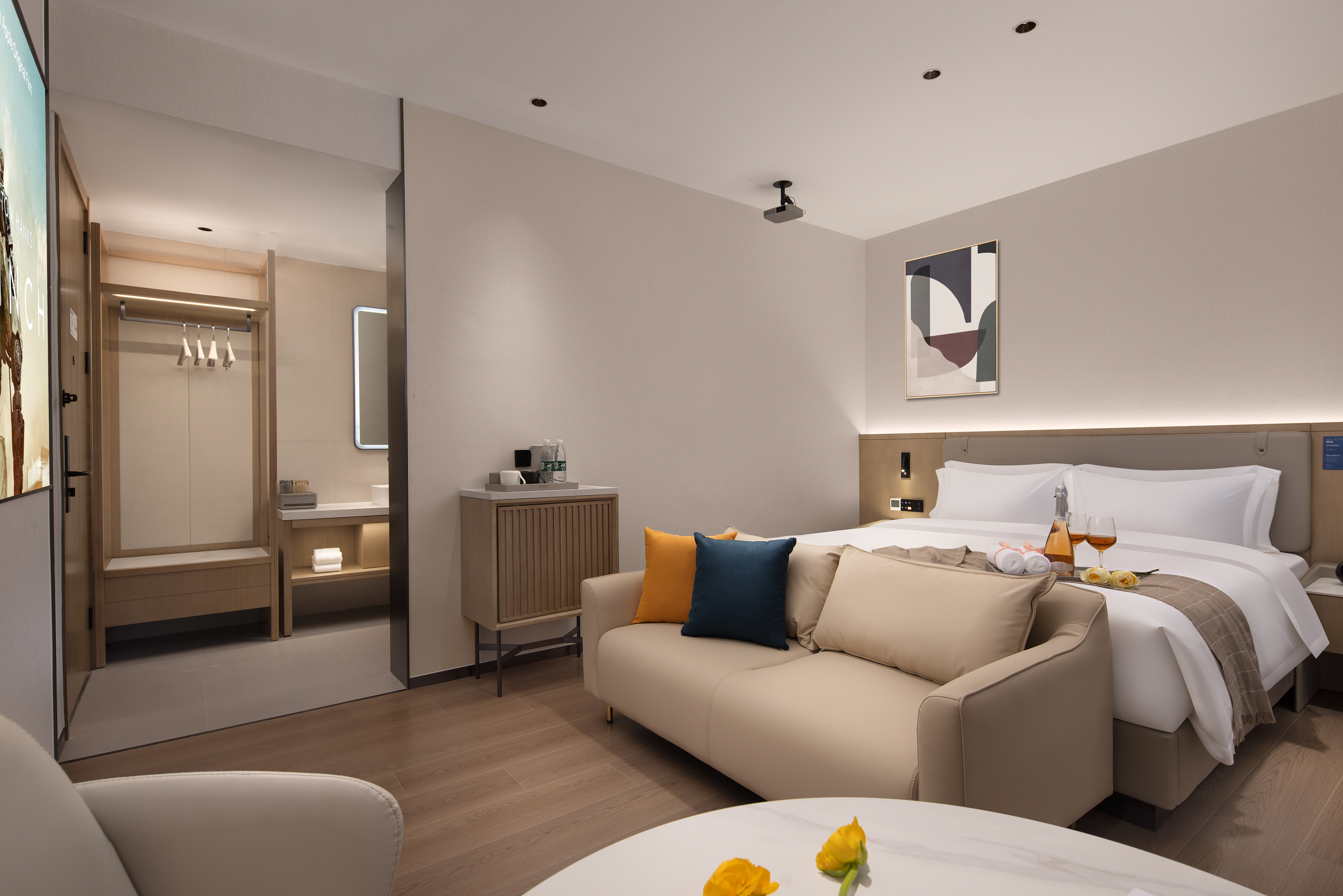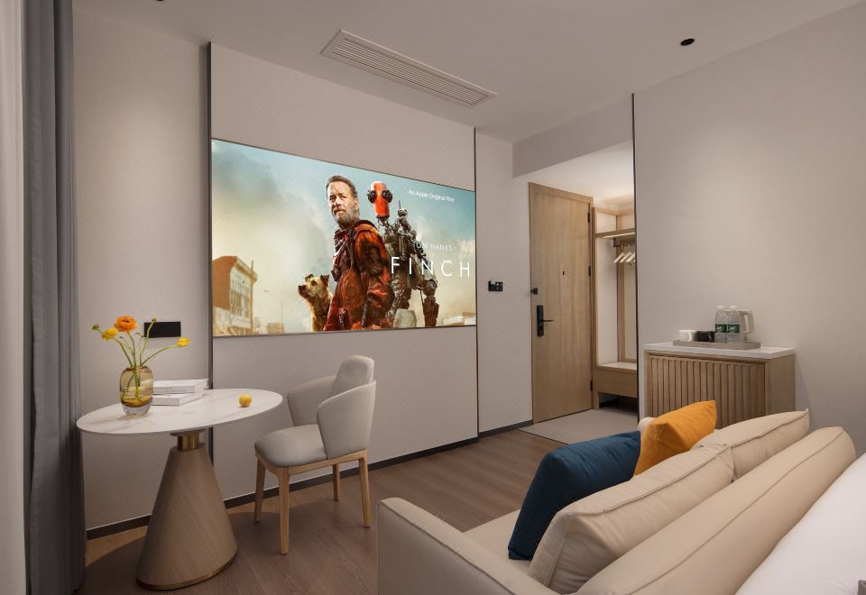 影院大床房「超清巨幕投影+无线投屏+影视会员」