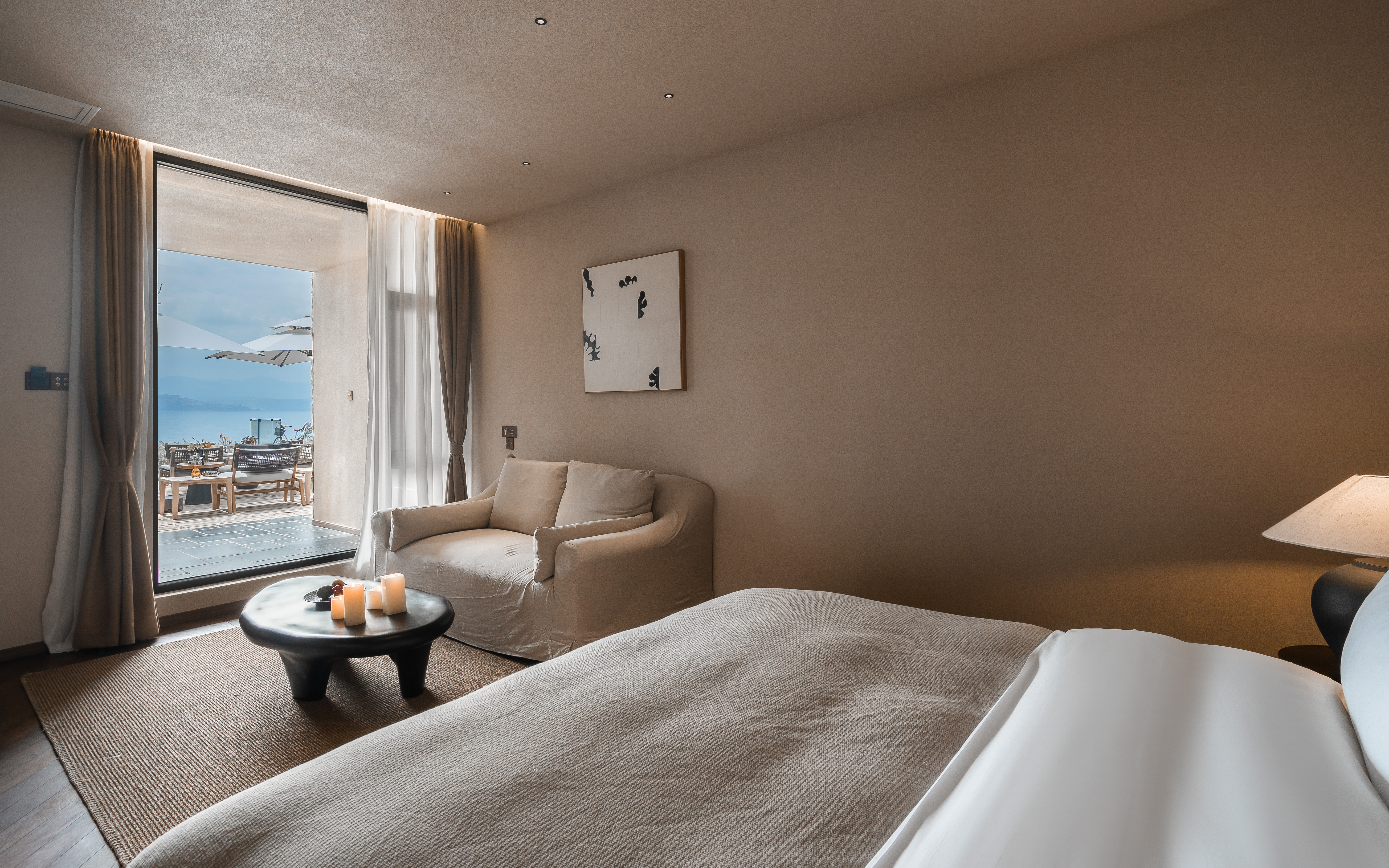 月丹—侧海景大床房 .慕思乳胶床垫.鹅绒被.戴森吹风机.杜拉维特洗浴.APPELLES洗护套装.智能马桶