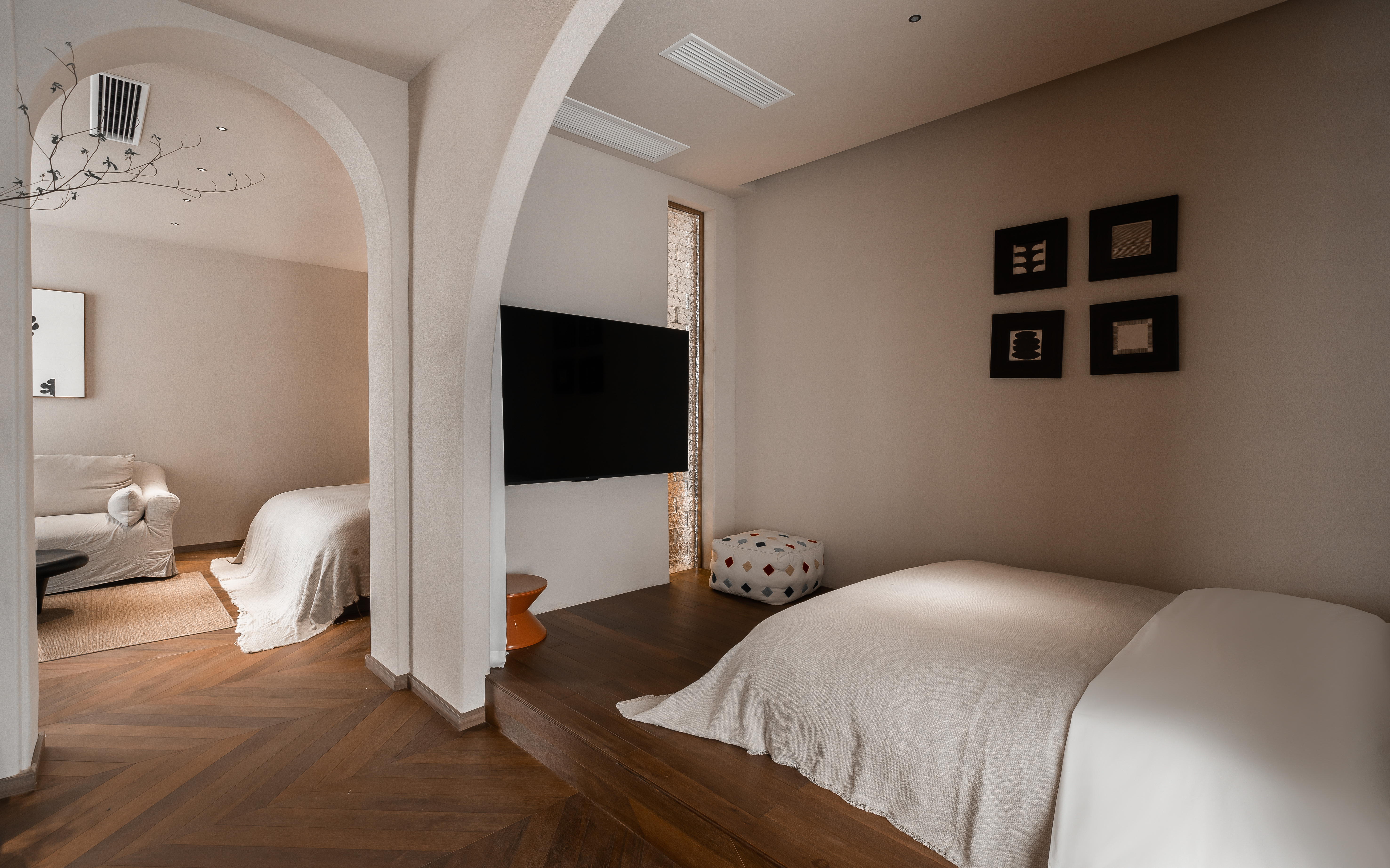 青棠—侧海景双床房·巨幕投影·马歇尔音响· .慕思乳胶床垫.戴森吹风机.杜拉维特洗浴.帕尔玛之水洗护套装.智能马桶