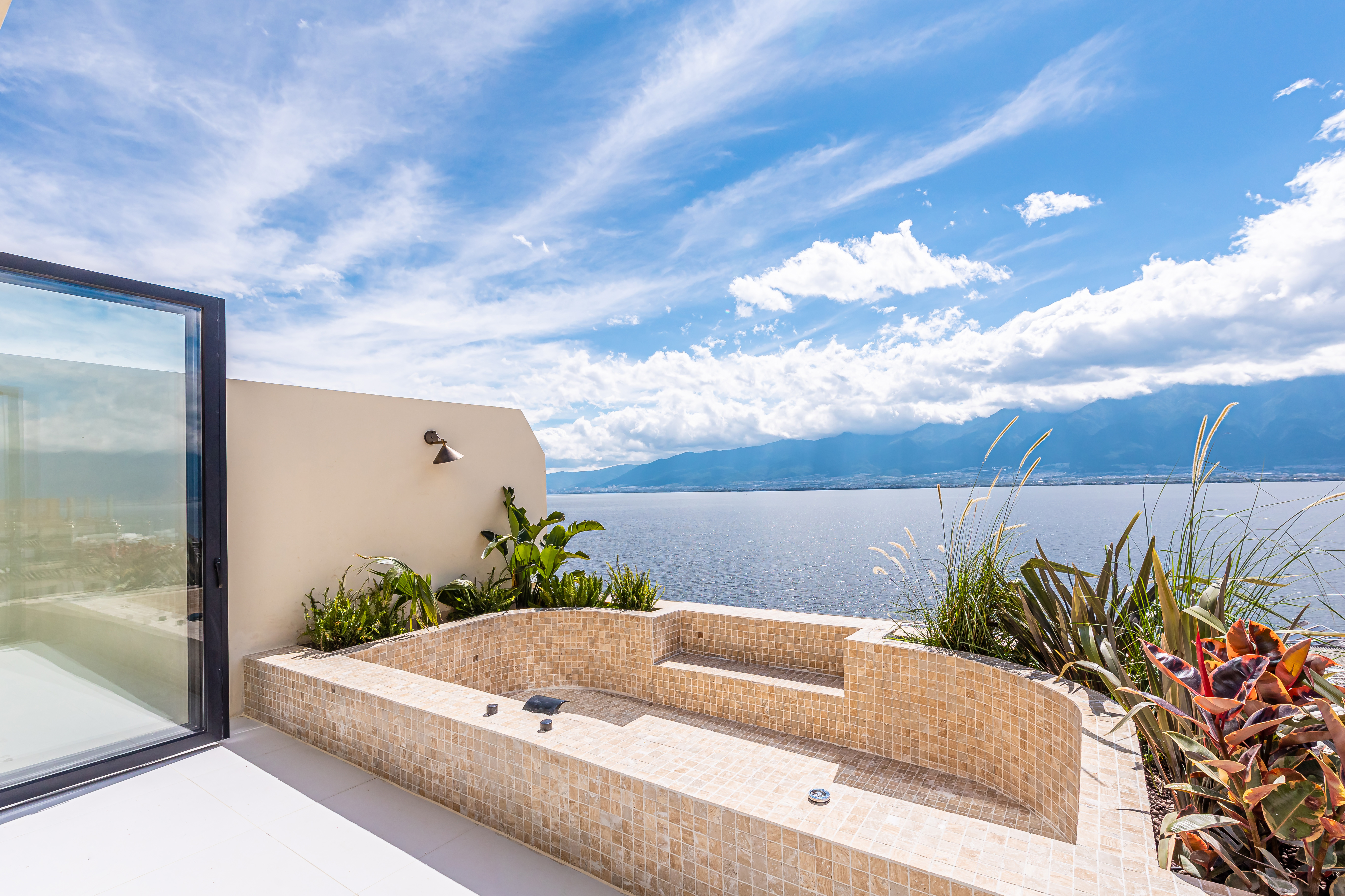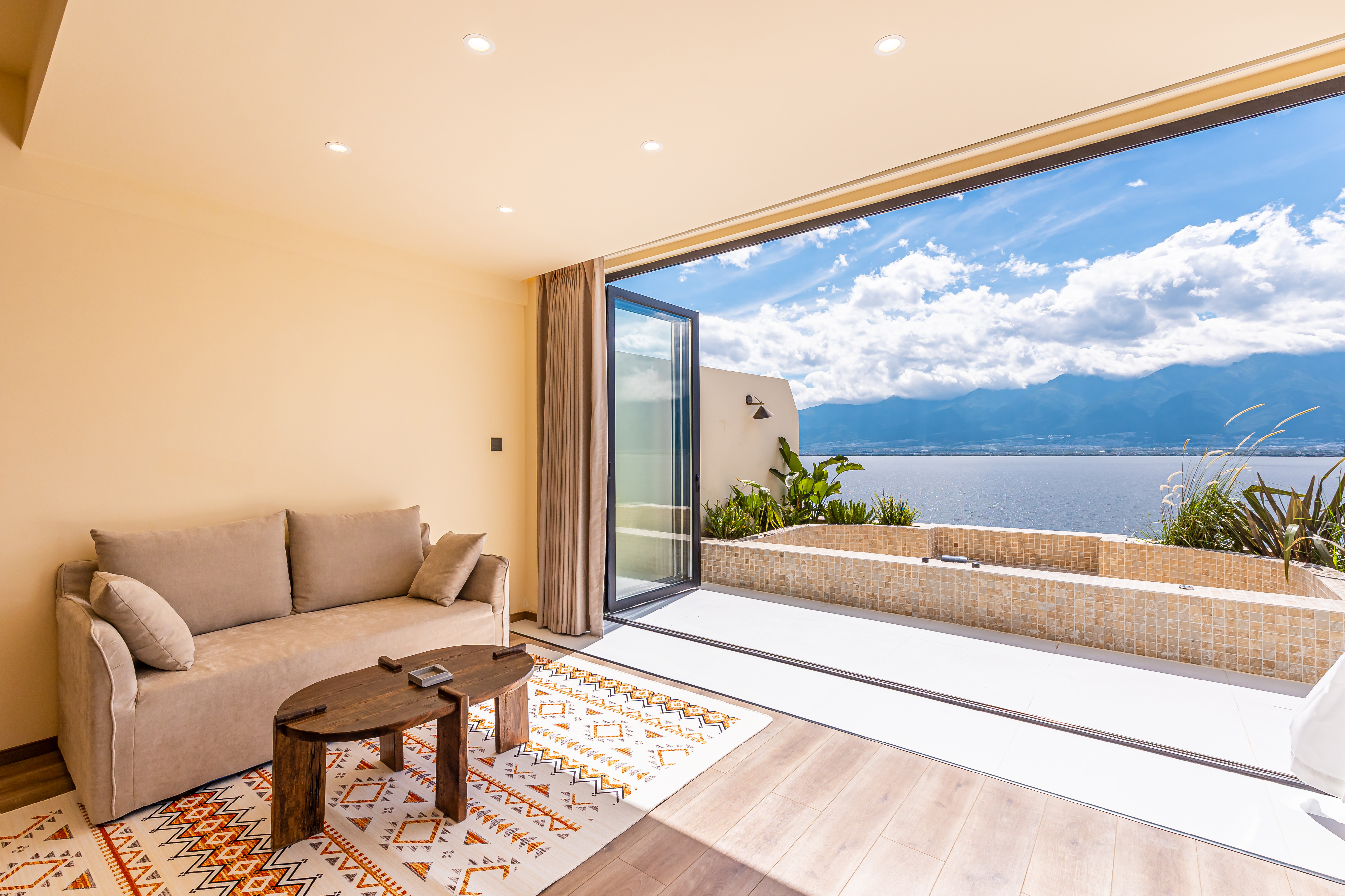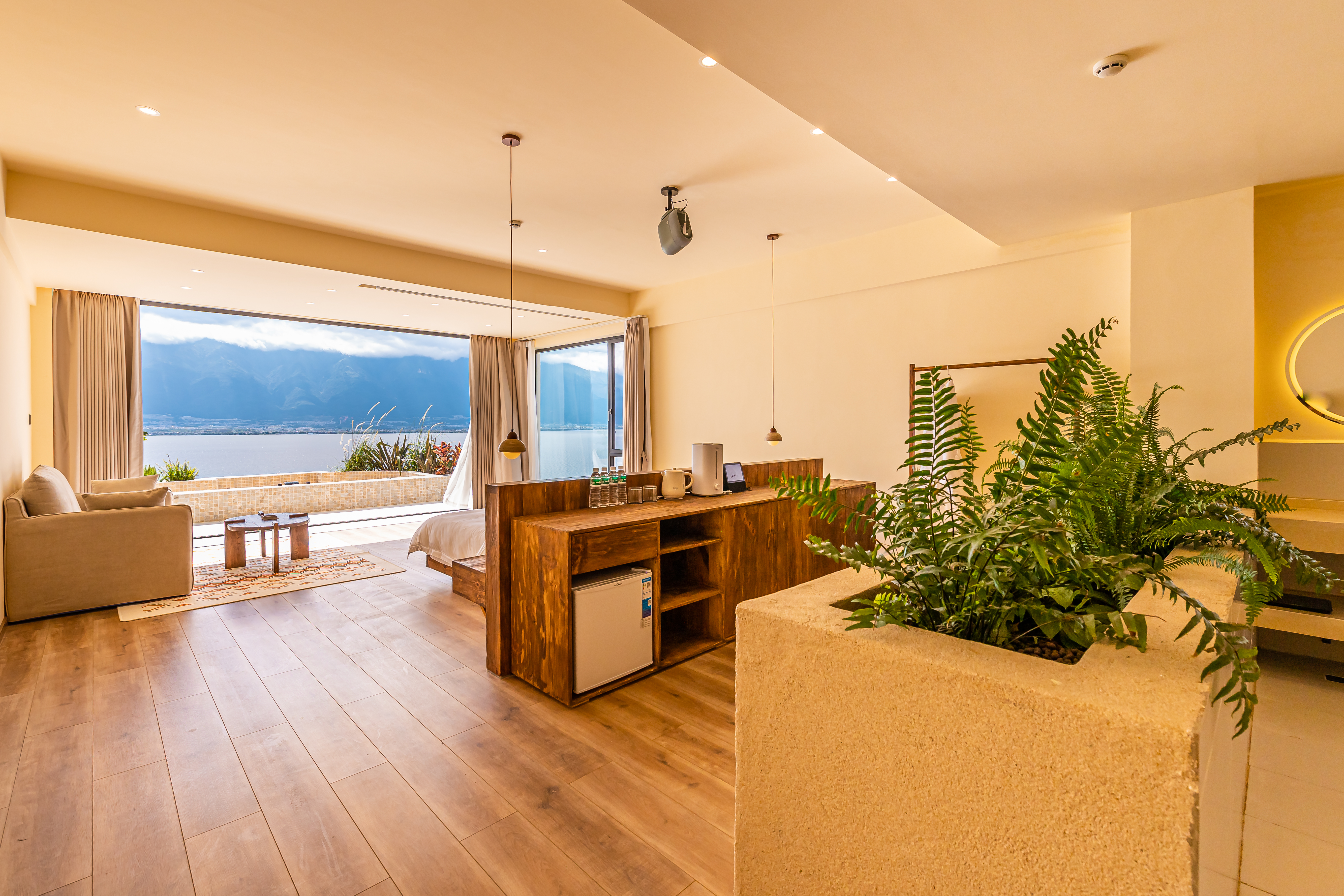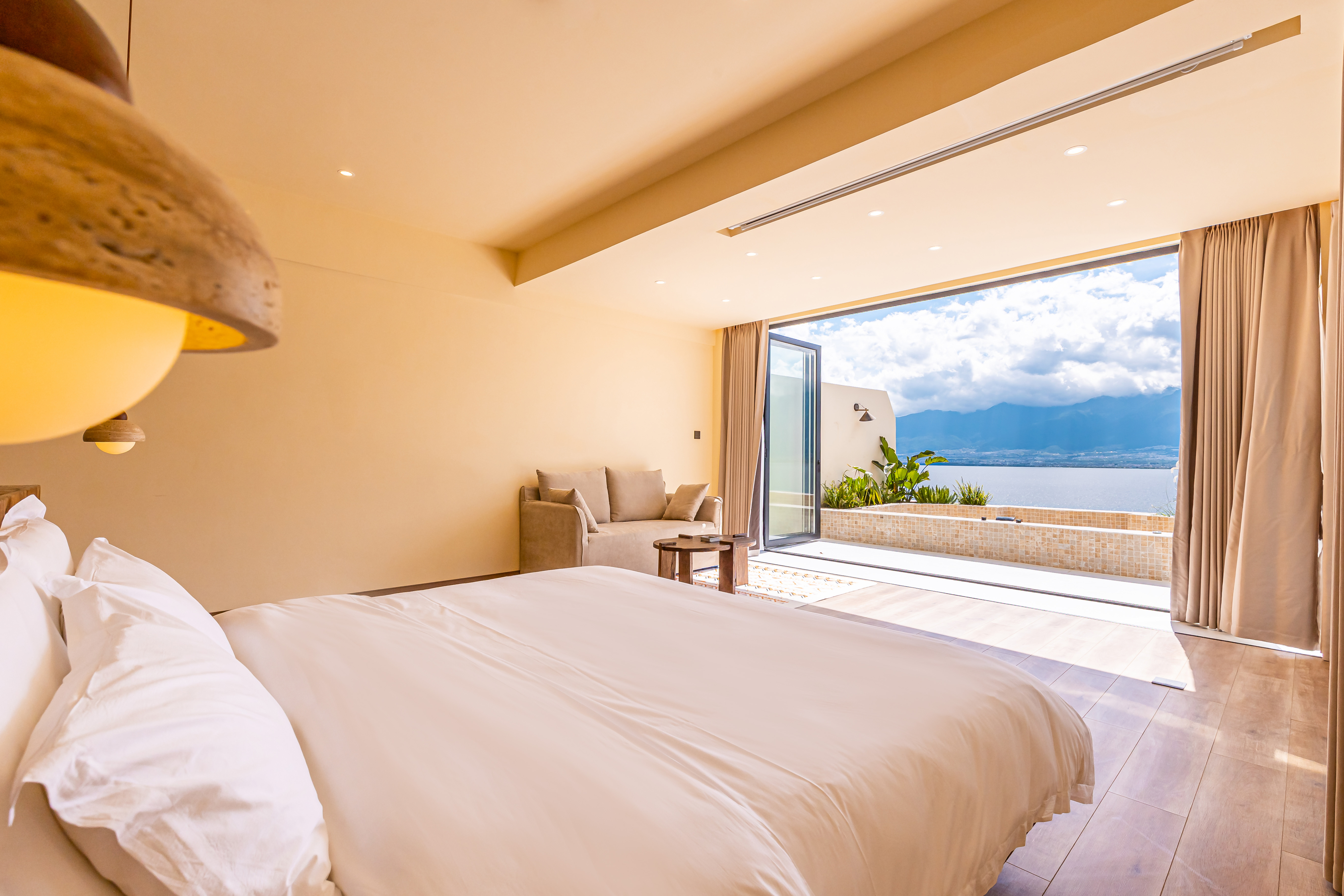 顺遂·海景露台特大床房|海景泳池冷热可调|落地摺叠窗|日落|金可儿床垫|恒温花洒|智能客控|冰箱|投影